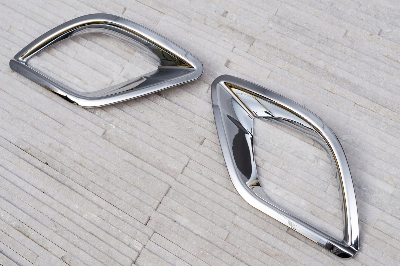 У комплект входить набір з двох чохлів для ламп. Виріб виготовлено з високоякісного хромованого ABS пластику. Вони кріпляться за допомогою двостороннього скотча Scotch 3M, наклеєного на внутрішню сторону елементів. Рекомендуємо професійний монтаж.