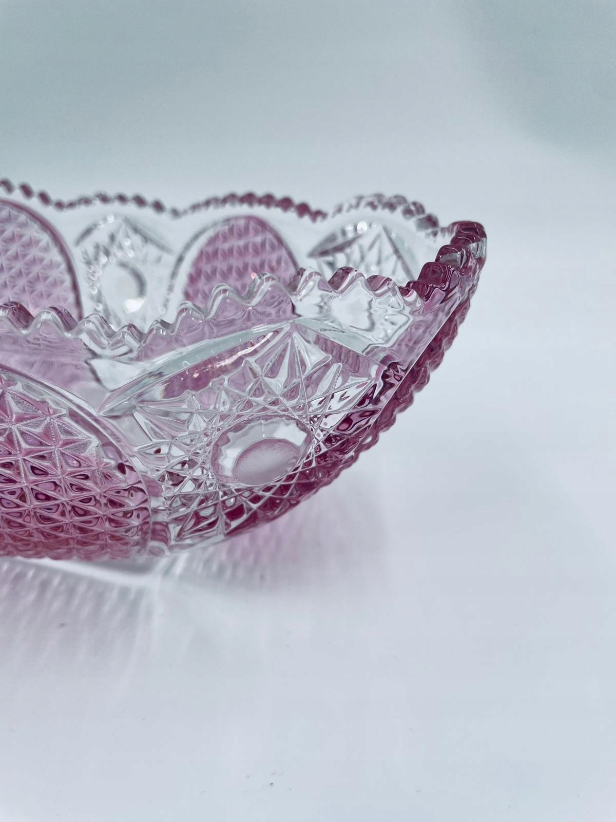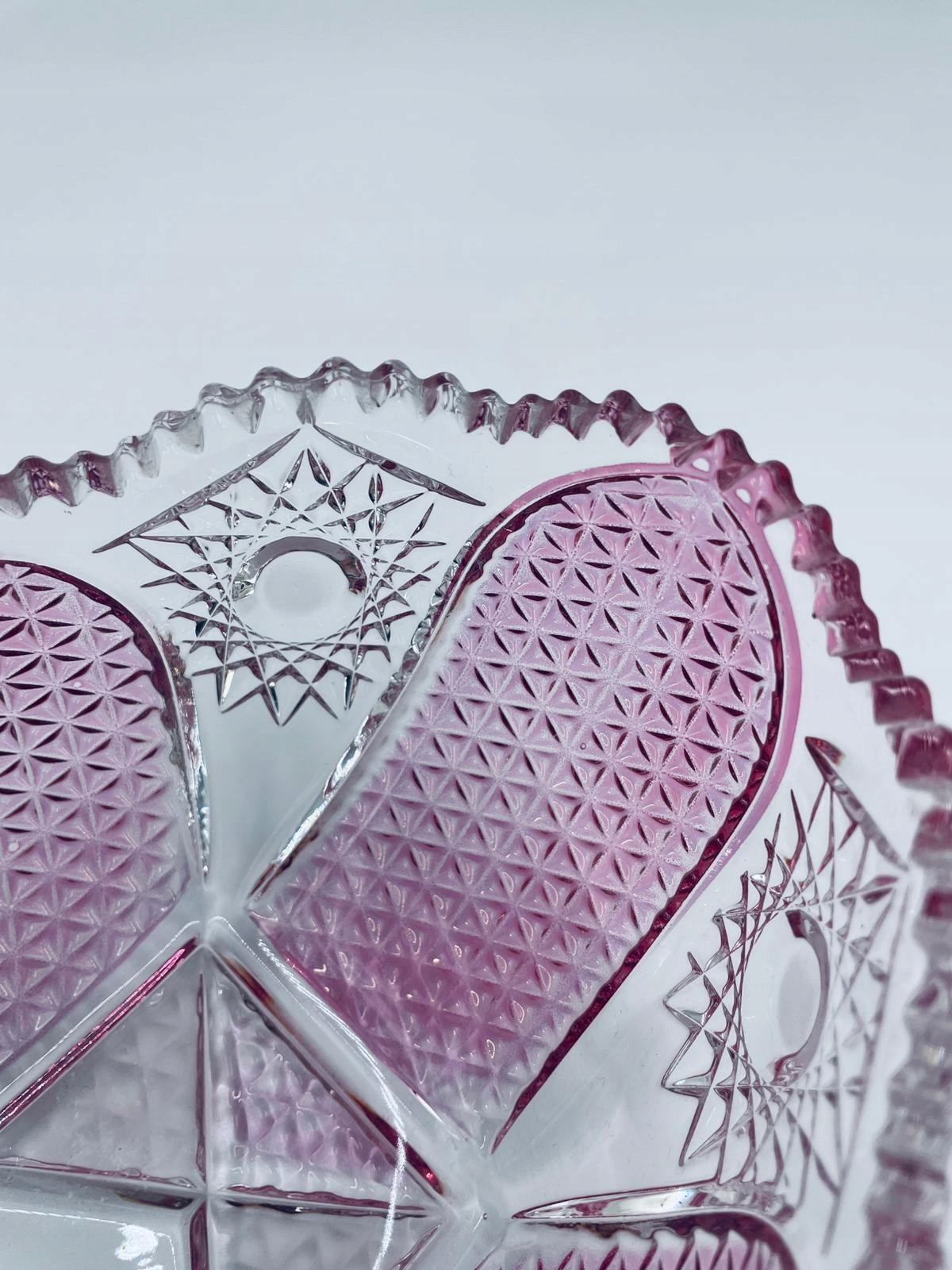 Декоративна чаша Walther Glas Bellevue, виготовлена з високоякісного кришталевого скла. Чаша овальної форми з унікальним рожевим відтінком, прикрашена складним візерунком із гранованими деталями та зубчастим краєм.