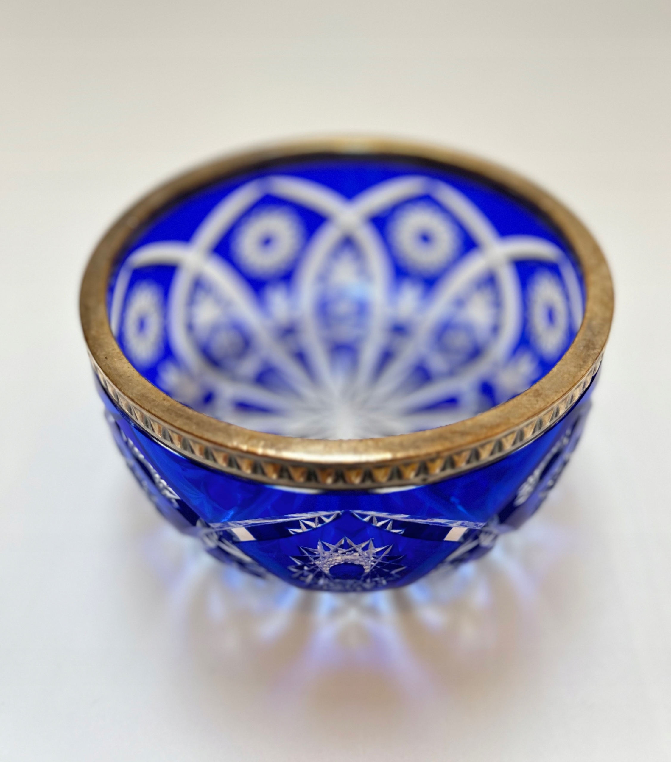 Представляю вам кришталеву чашу унікального кобальтового синього кольору. Чаша з багатим гравіюванням, глибокий виріз, унікальний малюнок і колір створюють прекрасний ефект проникнення світла. Край чаші оброблений декоративною срібною фурнітурою.