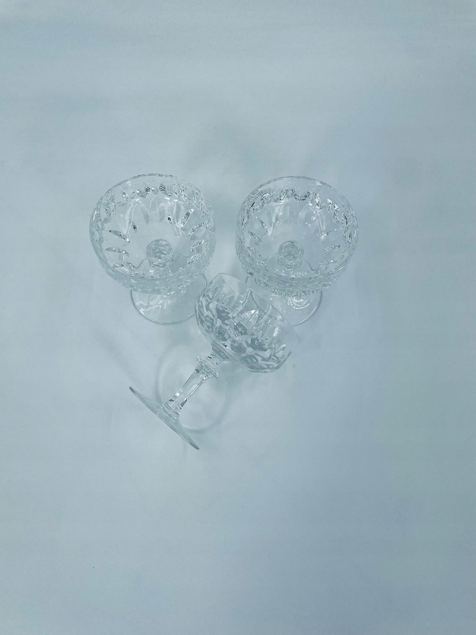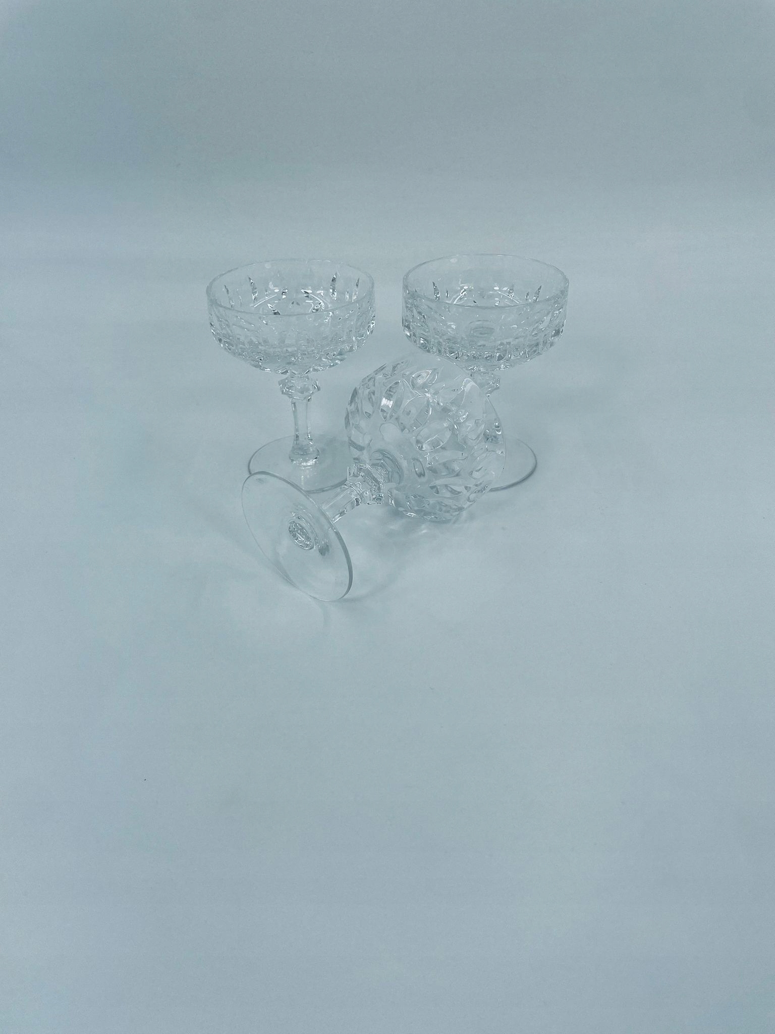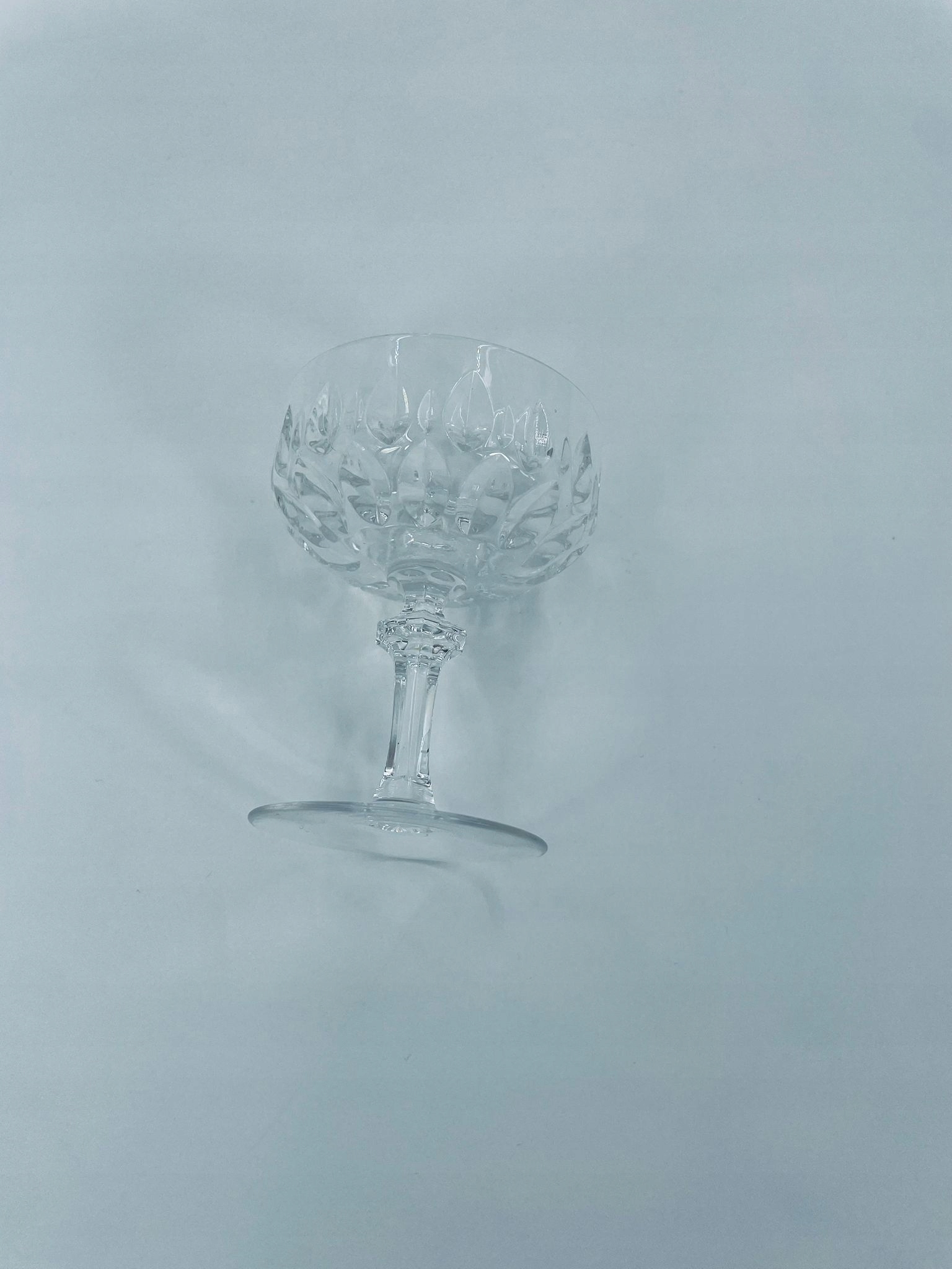 кришталеве скло, прозорий. Скло з характерною, різьбленою краном та декоративною ногою, що надає елегантний і класичний вигляд. Одне скло має пошкодження верхнього рано, а друге на основі.
