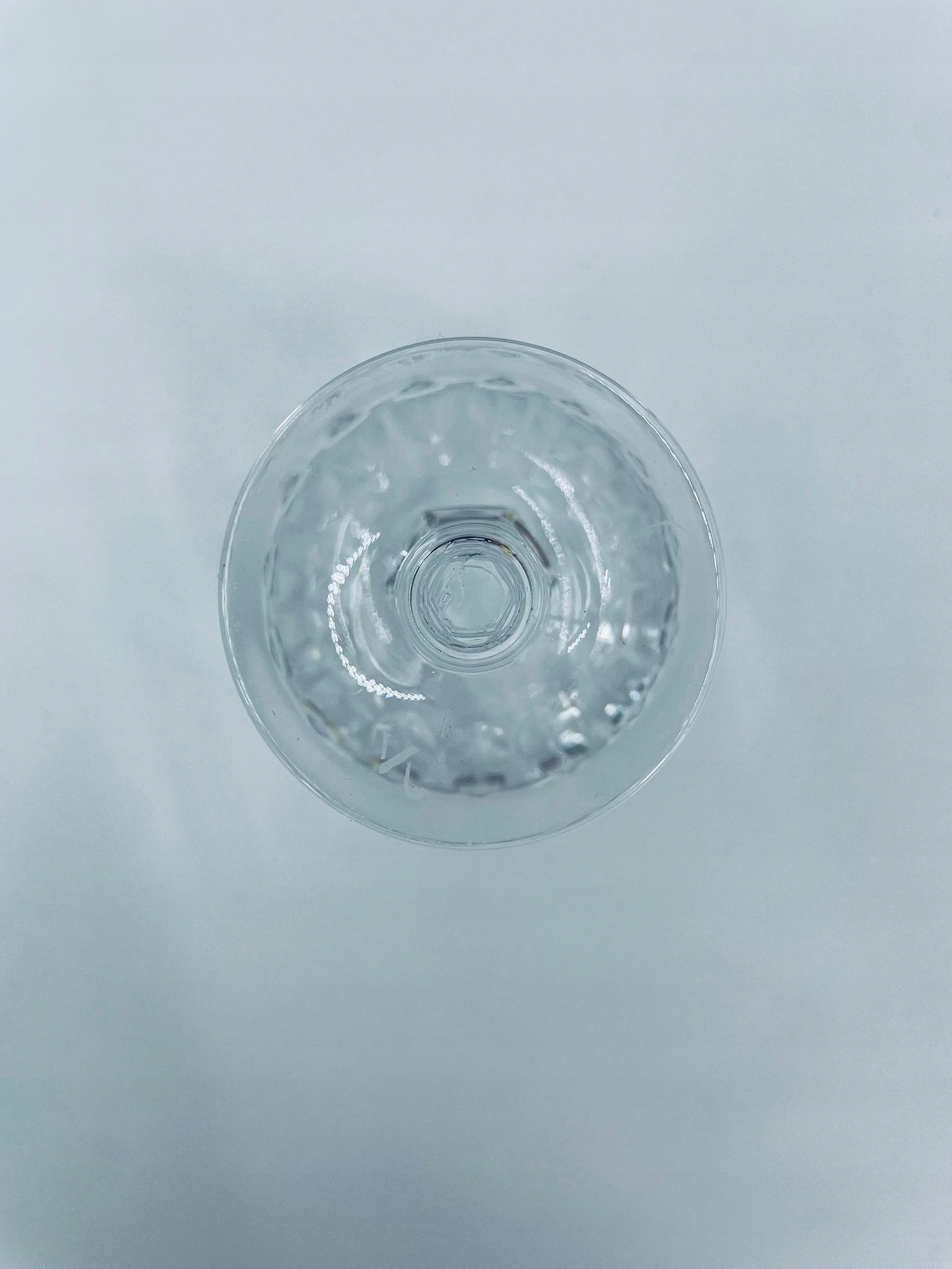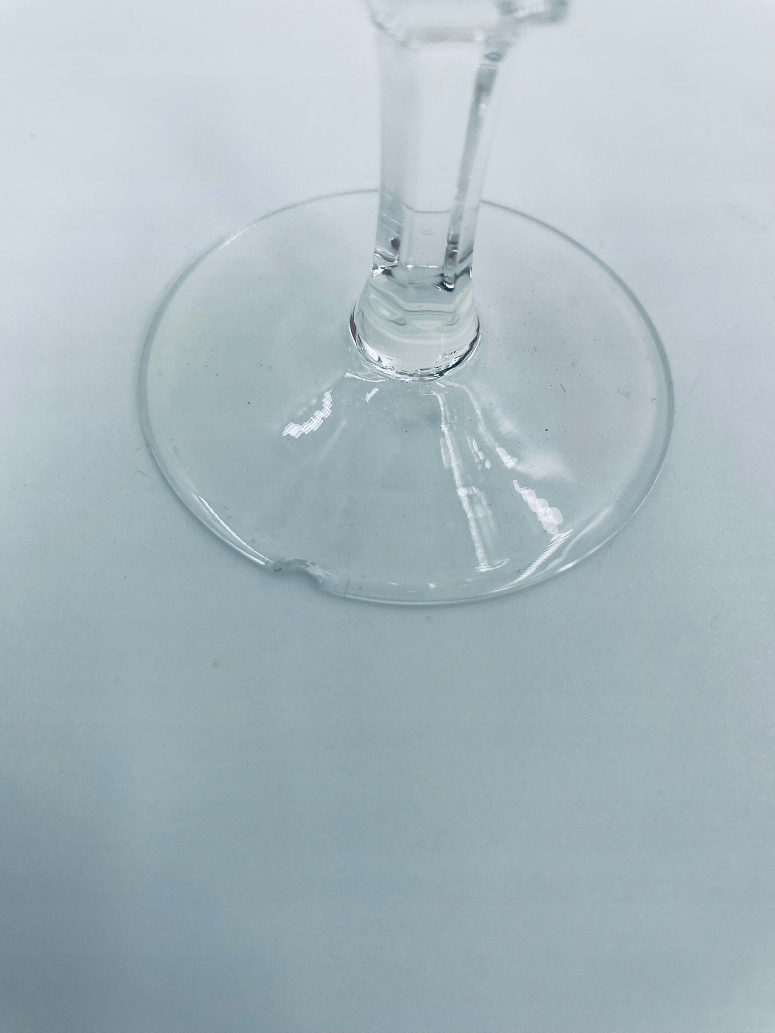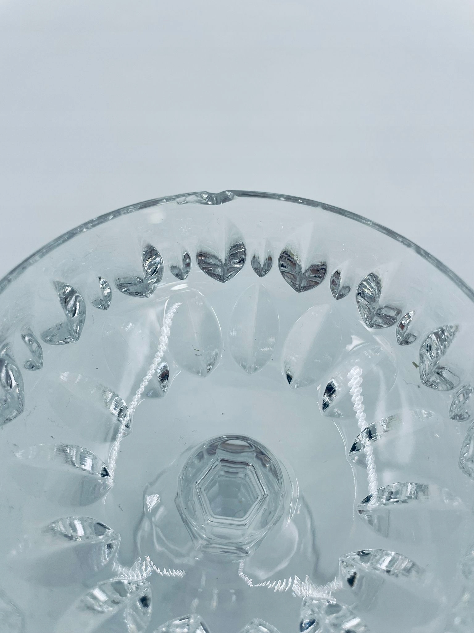 кришталеве скло, прозорий. Скло з характерною, різьбленою краном та декоративною ногою, що надає елегантний і класичний вигляд. Одне скло має пошкодження верхнього рано, а друге на основі.