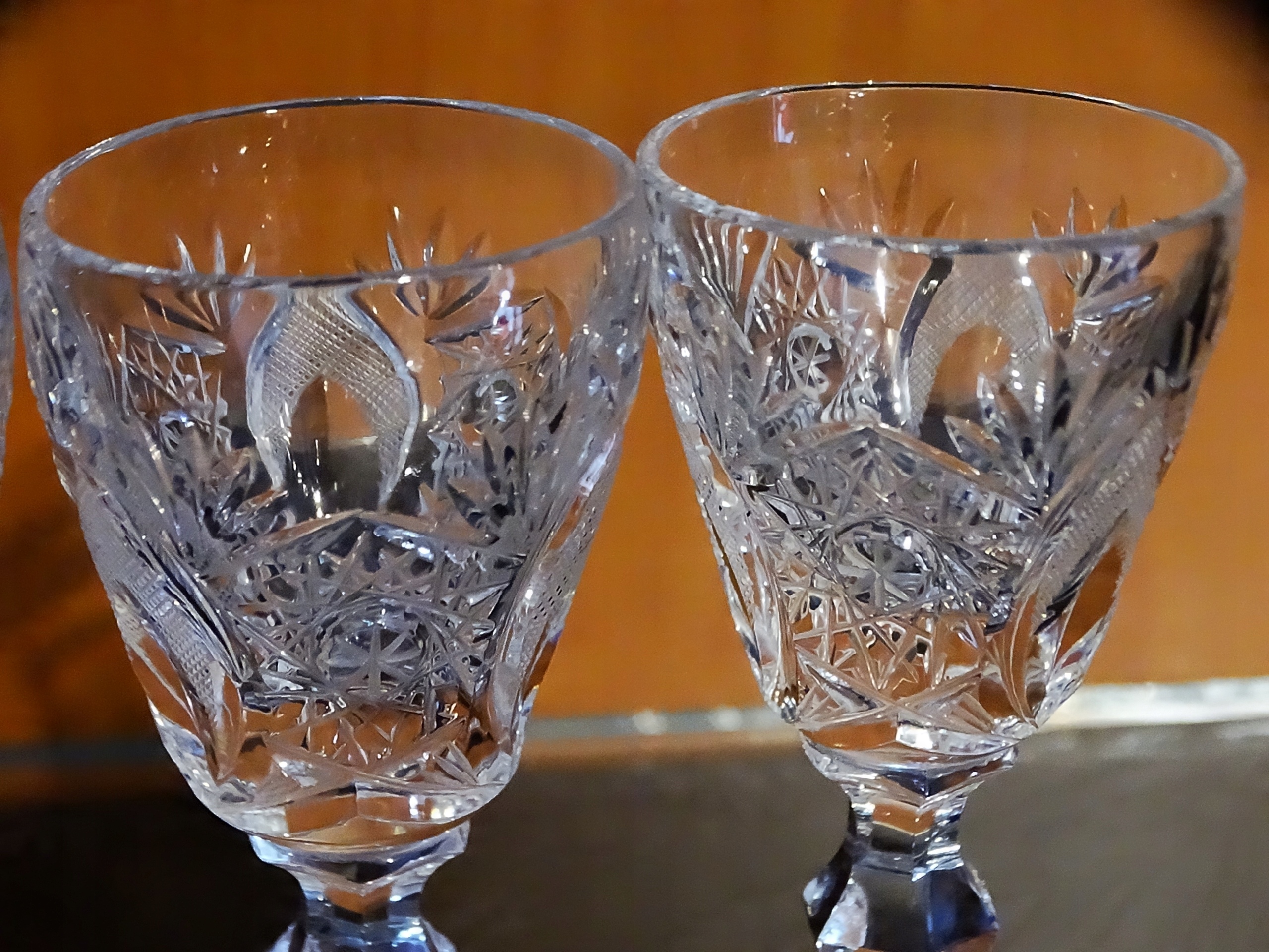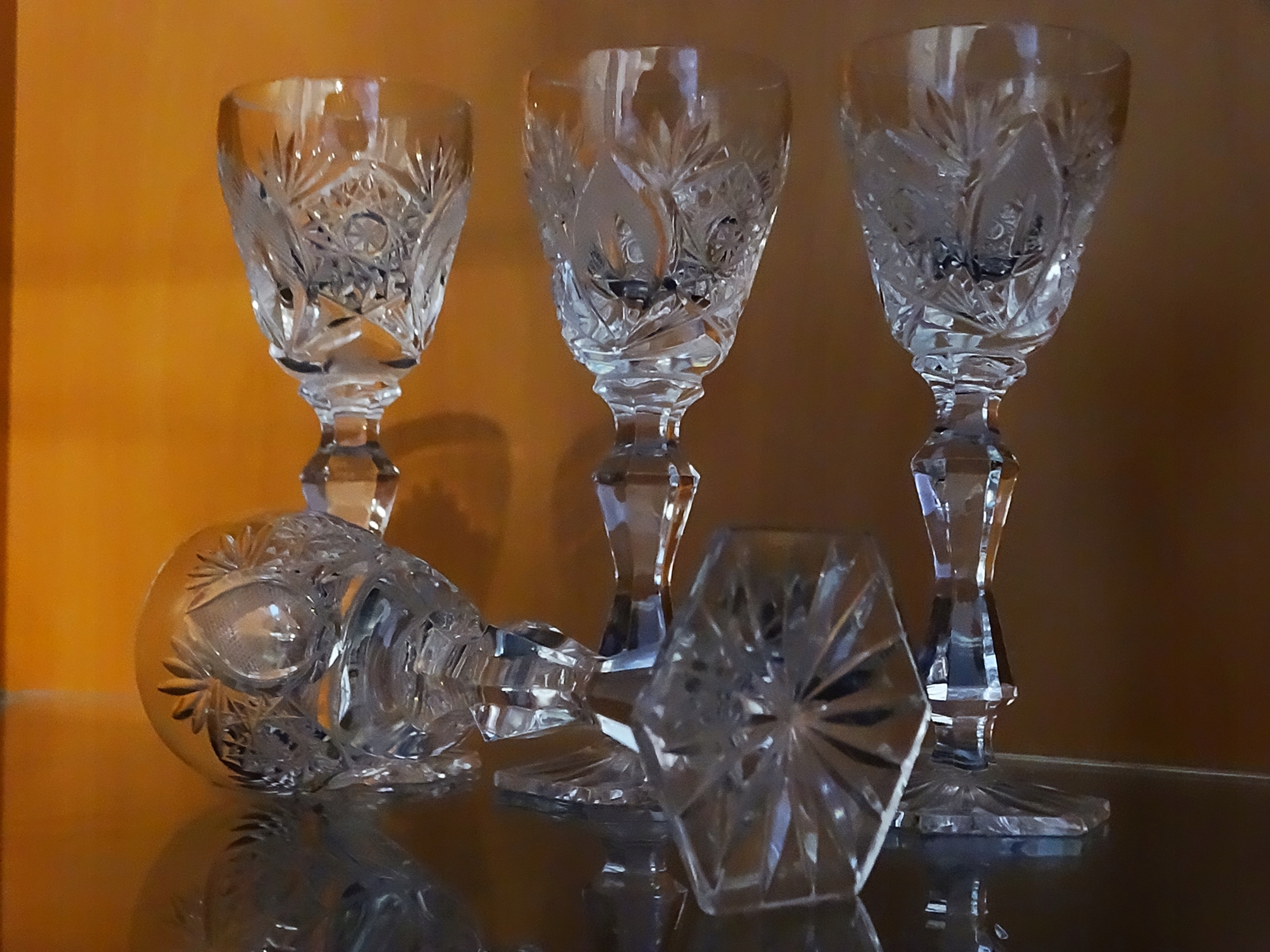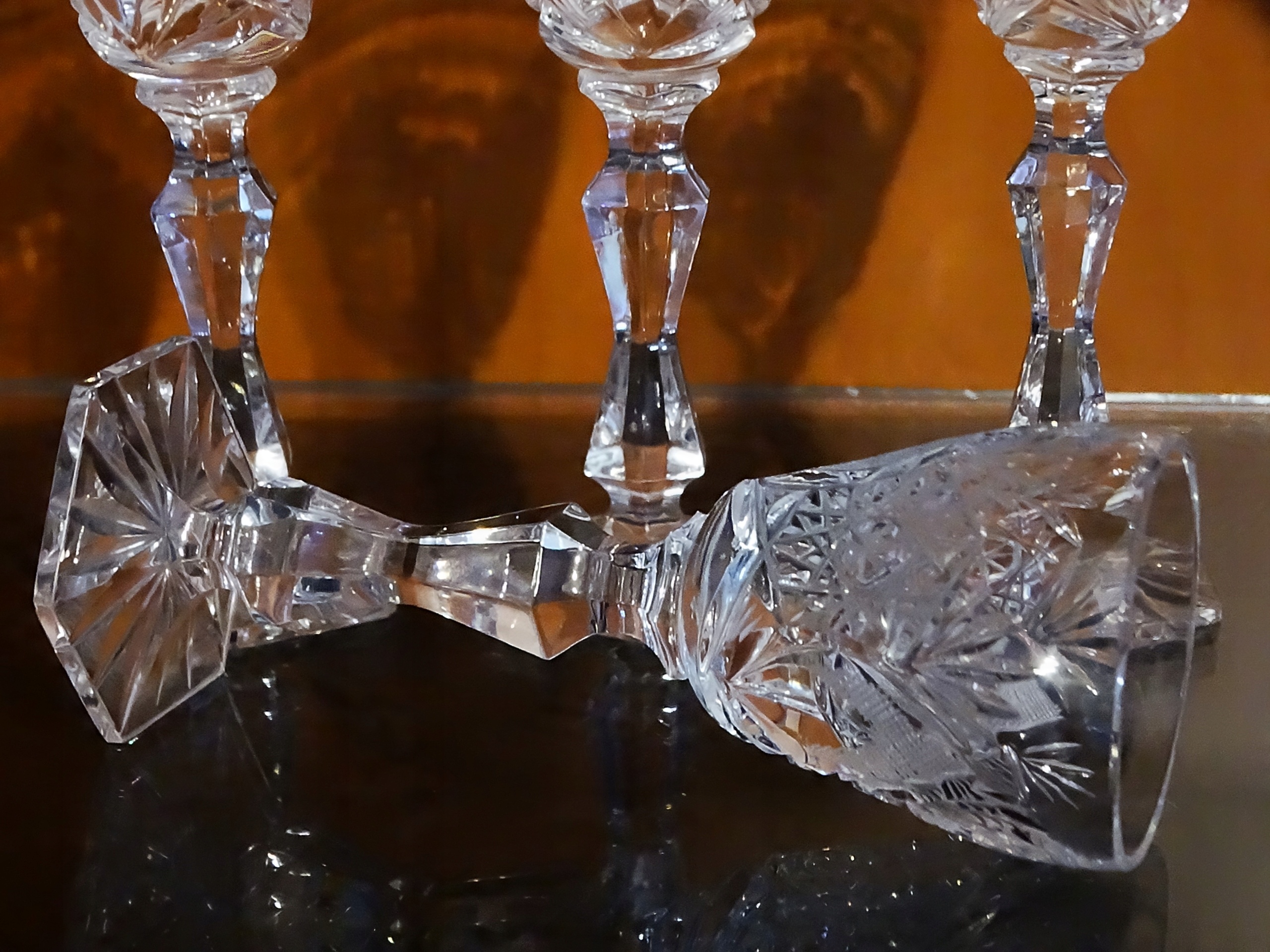 окуляри, що використовуються в дуже хорошому стані, як видно на опублікованих фотографіях - немає ознак використання (як нові). Насправді вони виглядають набагато красивішими та гідними, ніж на знімках. Кристалічні окуляри -це елегантні страви, які зазвичай використовуються для подачі спиртів високого відсотка, таких як горілка, лікери або настоянка. Їх історія сягає століттях, а їх популярність є результатом краси та довговічності кристала. У минулому кришталеві окуляри були символом розкоші та багатства, доступними лише заможним шаром суспільства. В даний час вони частіше зустрічаються, але вони все ще є цінним елементом посуду.