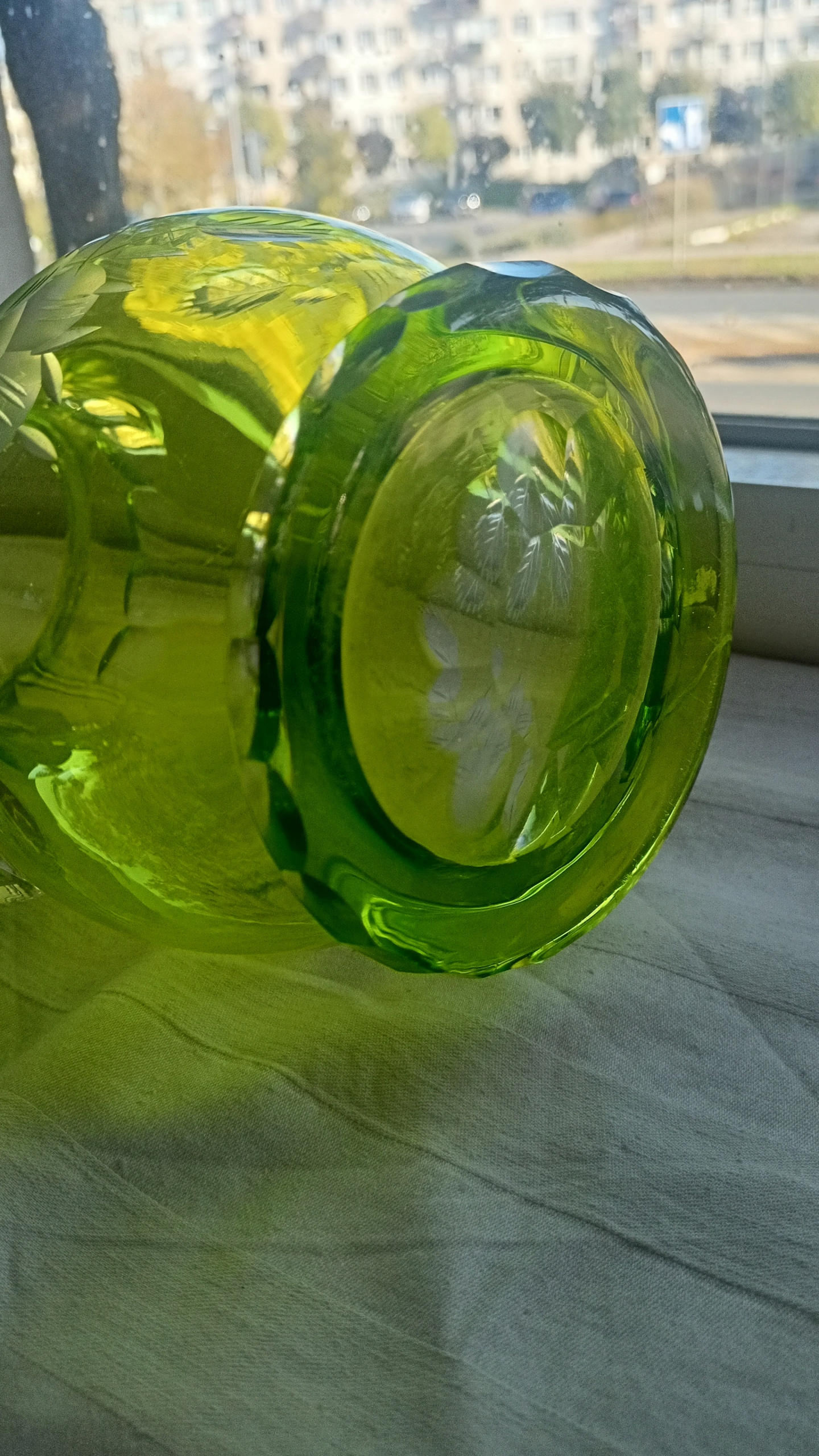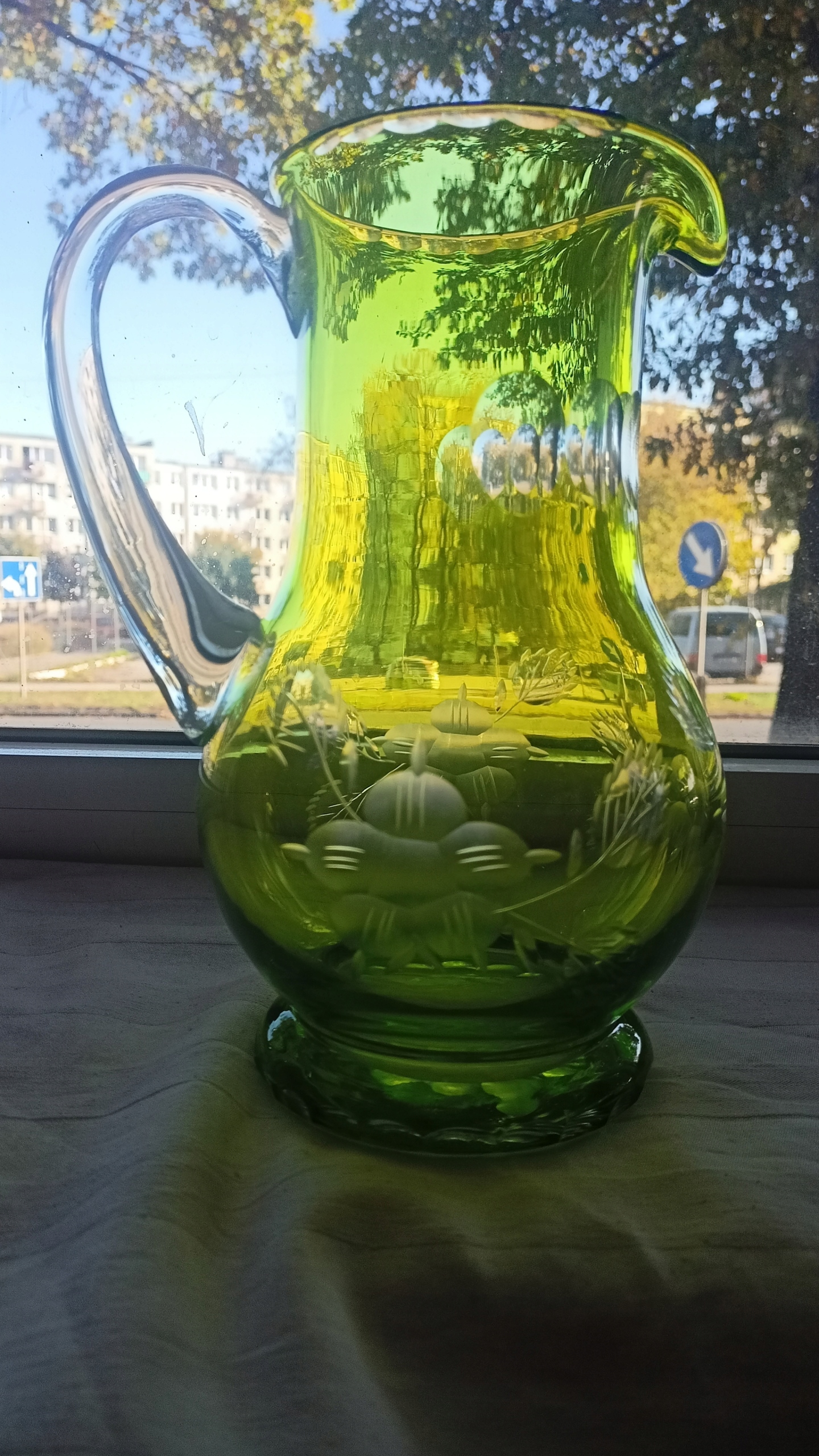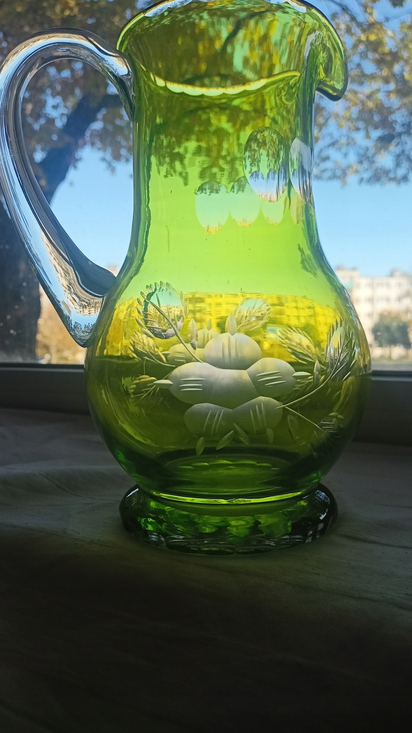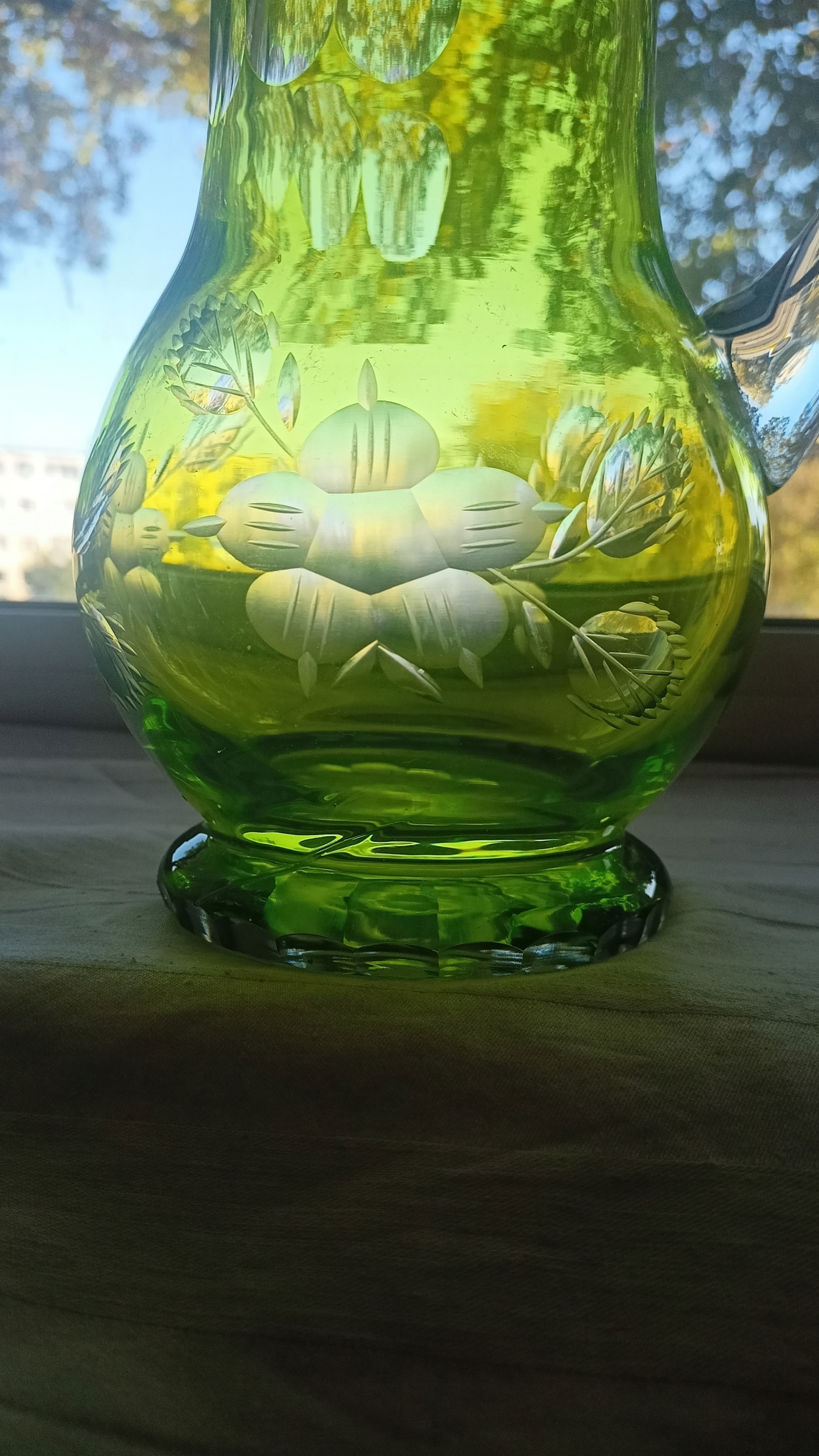 4 Екологічне кристалічне скло зі зниженою кількістю оксиду свинцю до 12%. Глечик з великими пропорціями, пропорційна лінія. На основі широкої ноги з розеткою. Весняний зелений глечик з прозорою ручкою. прикраси з шліфованими рослинами. Глечик має висоту 23 см і близько 1,3 літра ємності. - Дуже добре, фабрика.