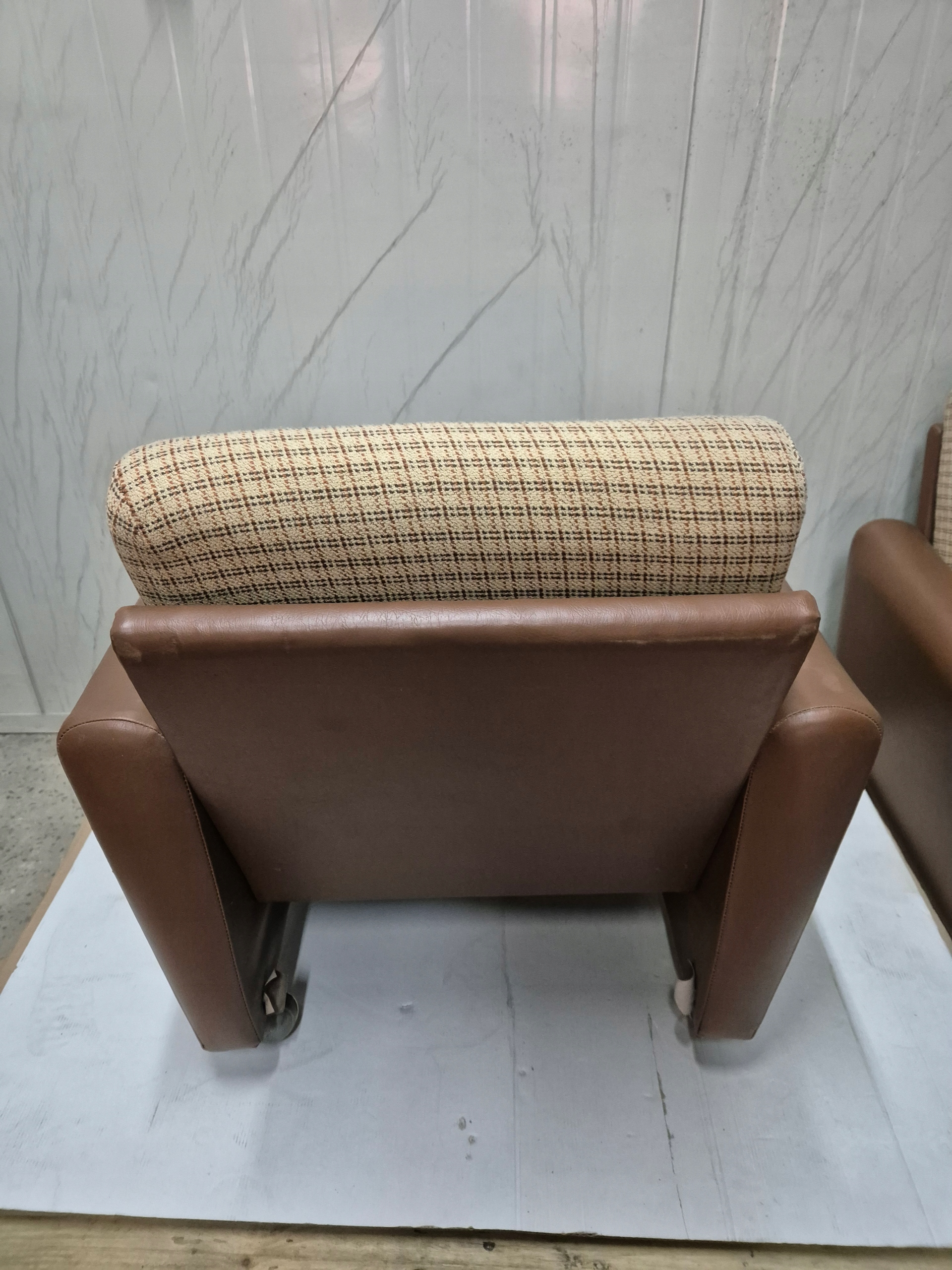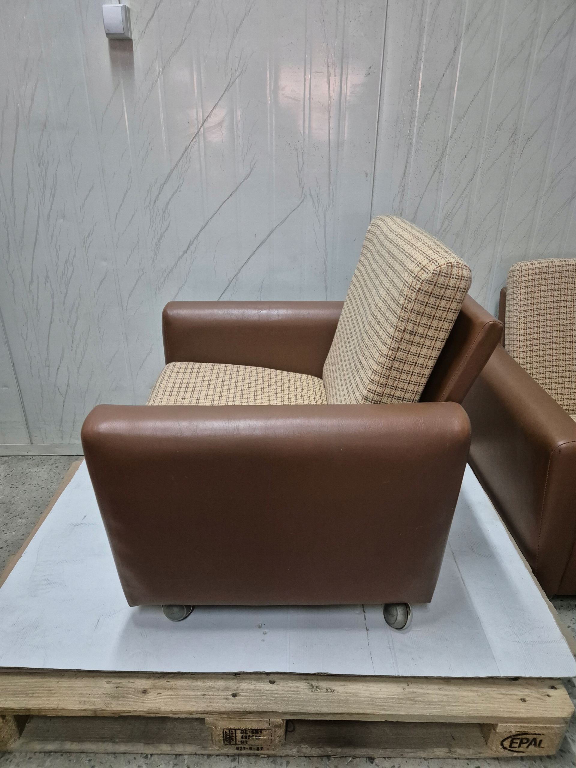 Збережені в дуже хорошому стані, на коліщатках, спинки з коричневого шкірозамінника та подушки з картатої тканини.