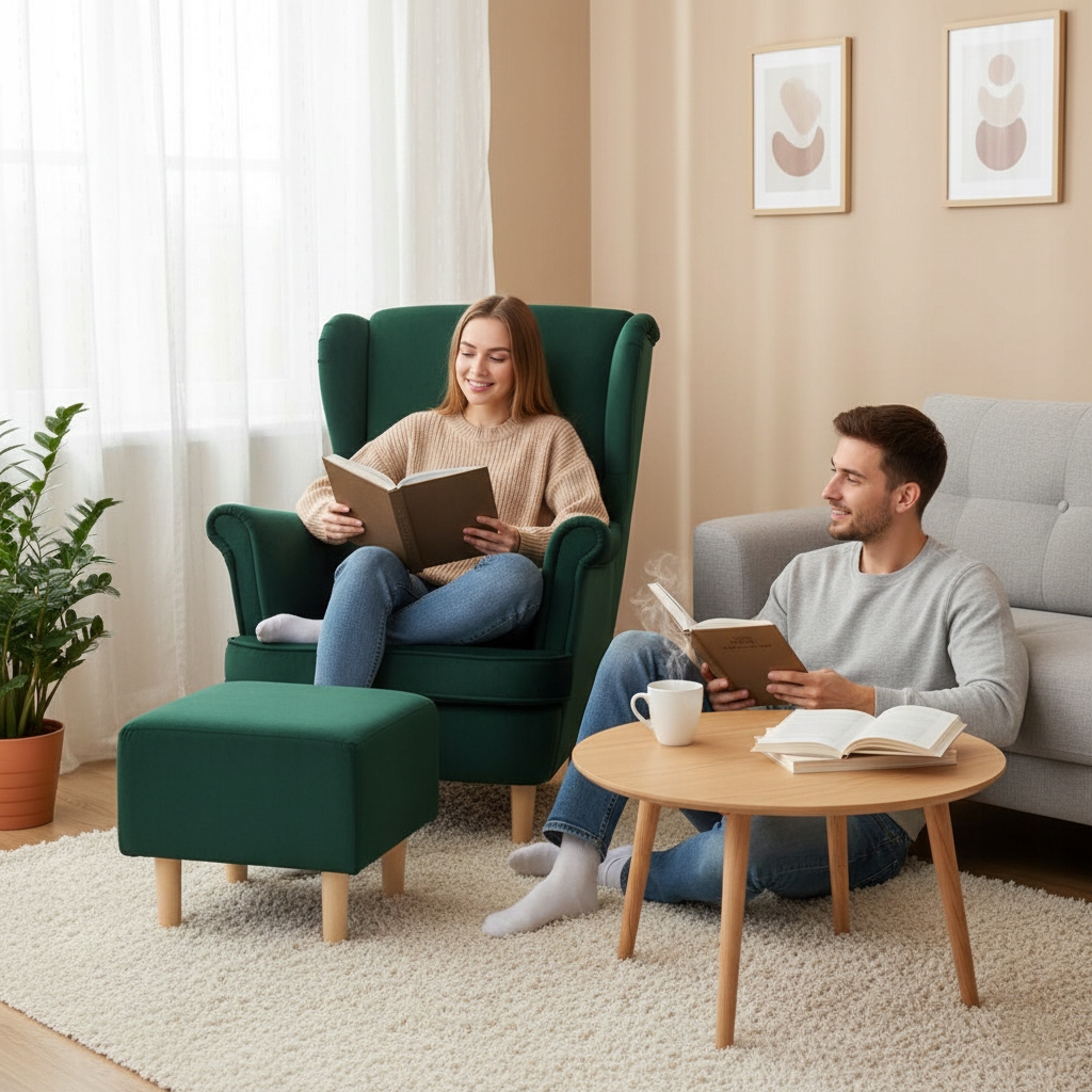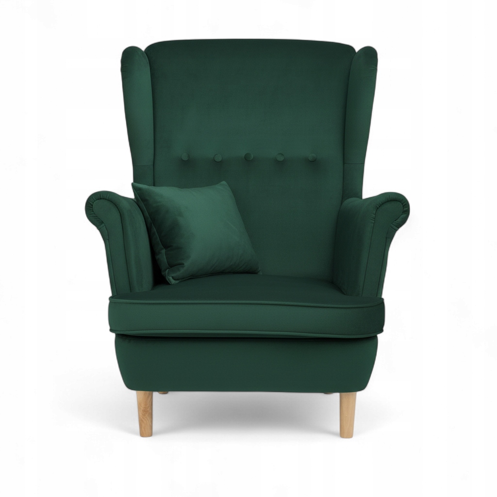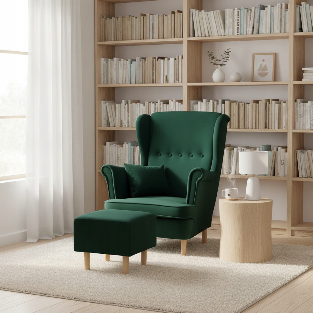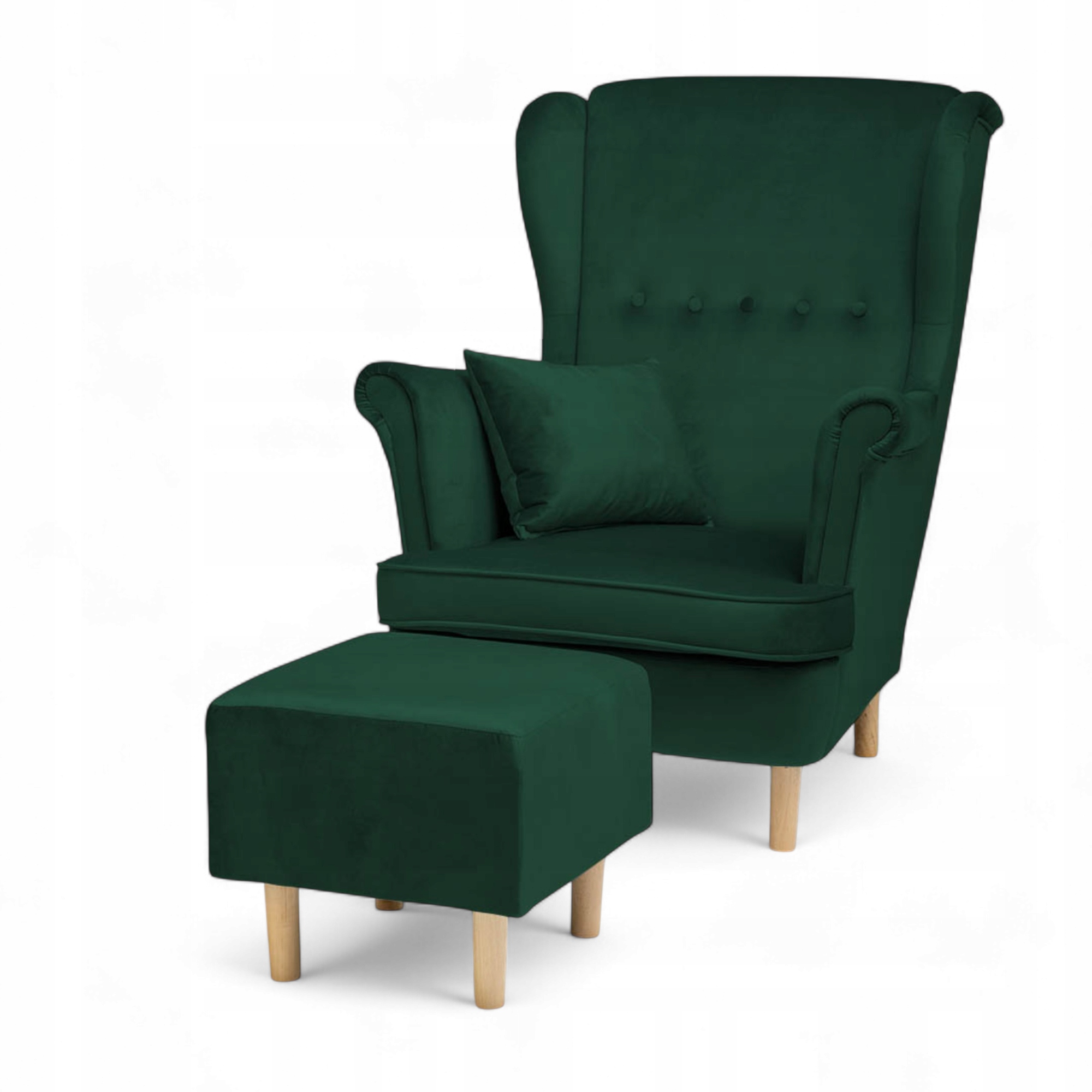 КРІСЛО ДЛЯ ВІТАЛЬНІ З ПІДНІЖКОЮ, ЗЕЛЕНА ПОДУШКА