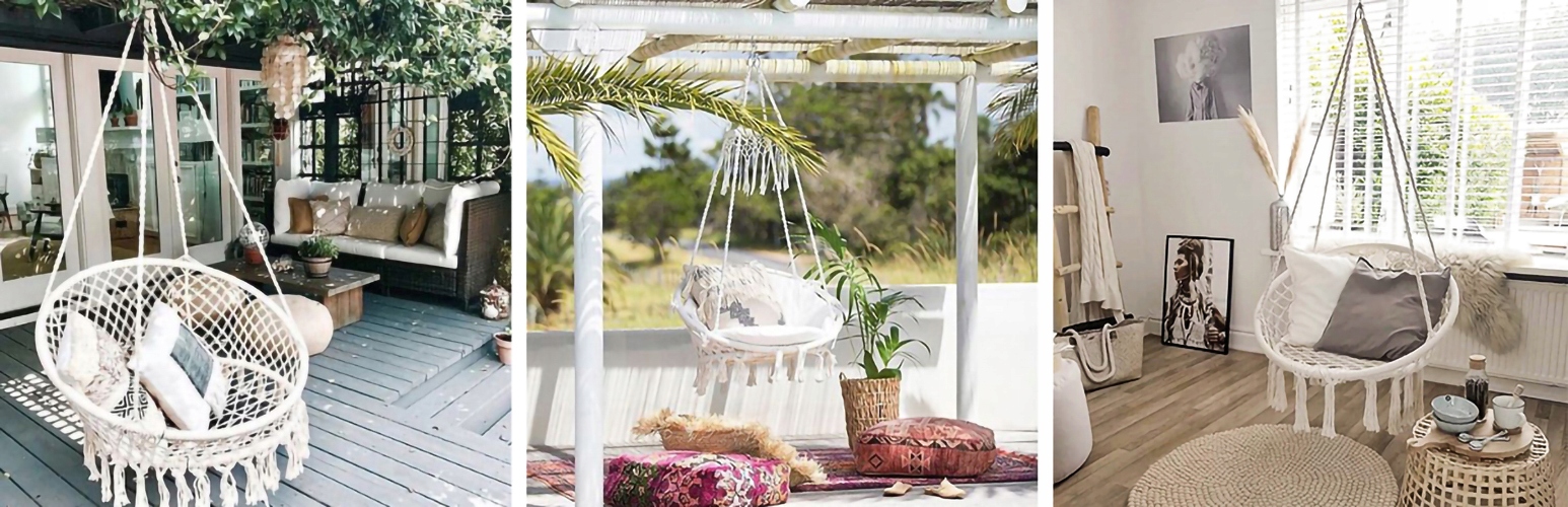 - ЗРУЧНО – гойдалка в бразильському стилі розроблена для забезпечення максимального комфорту під час відпочинку. Має високу спинку довжиною 35 см. Він виготовлений з бавовни з домішкою поліестеру, що робить його м'яким і приємним на дотик, і проводити час за ним - одне задоволення. Міцний залізний каркас обтягнутий мотузкою, завдяки чому кожен елемент закріплений - гойдалками можуть користуватися як дорослі, так і діти. Натуральний матеріал також забезпечує належну вентиляцію, що забезпечує комфорт використання підвісного крісла навіть у спекотні дні.