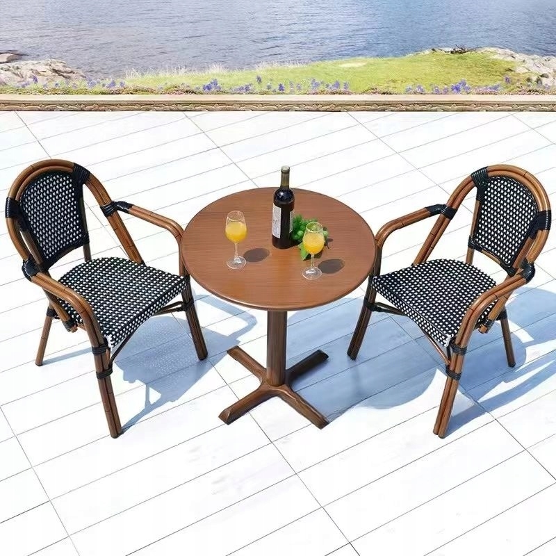 Натхненний стилем паризьких кафе. Можна використовувати як у приміщенні, так і на вулиці. Виготовлений повністю з алюмінію з ефектом горіхового дерева. Сидіння та спинка виготовлені із синтетичного плетеного матеріалу, стійкого до ультрафіолетового випромінювання.