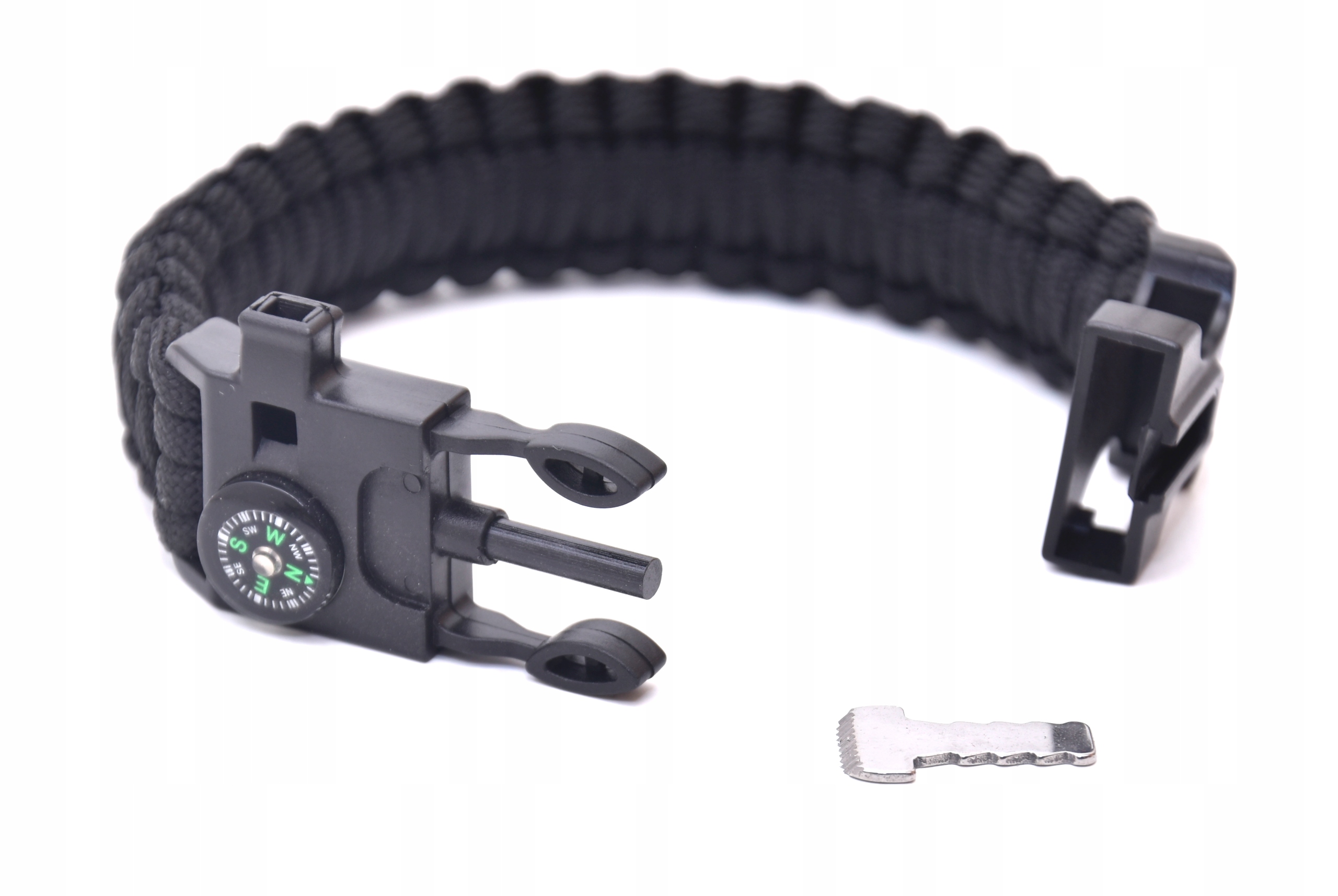 Застібка браслета містить розпалювач, аварійний свисток, ріжучий нож і компас.