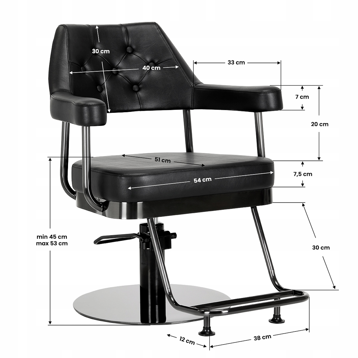Міцна кругла основа гарантує стабільність під час використання. Гладка поверхня з дзеркальним покриттям робить цей елементлегким у чистоті. Широке сидіння, наповнене піною відповідної жорсткості, забезпечує високу зручність використання та комфорт навіть під час багатогодинних процедур. Істотною перевагою є спеціальна для цієї моделі підніжка, яка забезпечує стійку опору для ніг користувача. Підлокітники розташовані на відповідній висоті, що дозволяє правильно розташувати плечі клієнта - це означає, що клієнт не ховає голову в плечі та не сутулиться - це явно покращує лікування, включаючи стрижку. Це сприяє точному виконанню послуг.