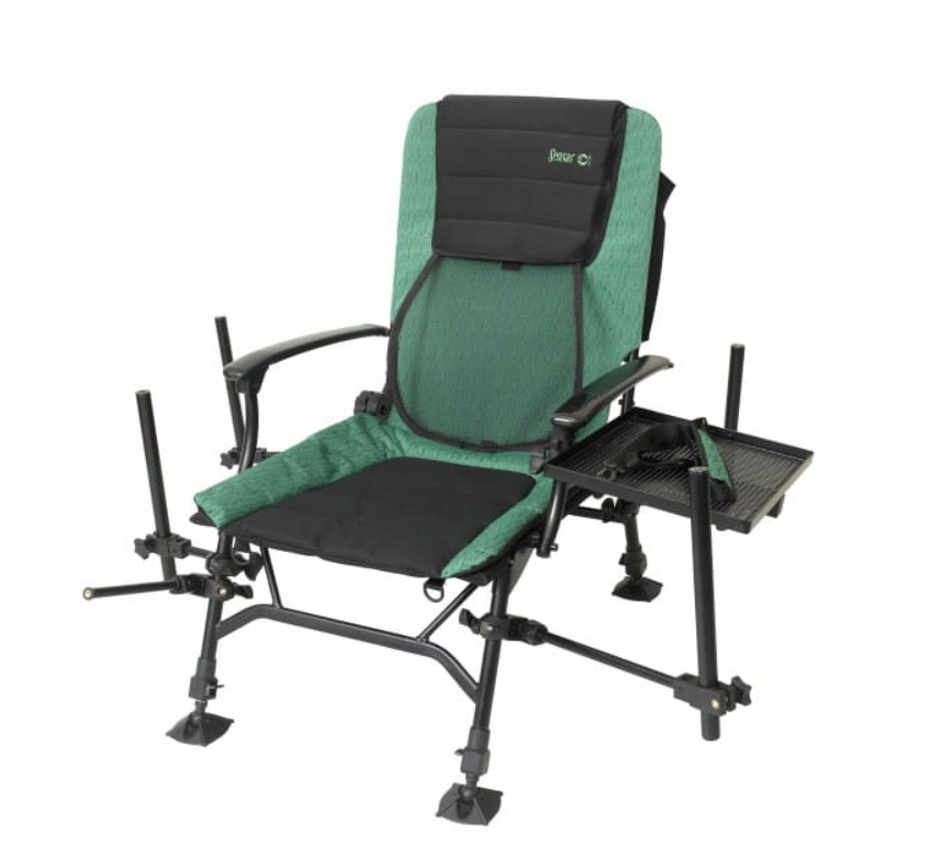 Він оснащений регульованими ніжками, які дозволять вам завжди почуватися комфортно біля урізу води, незалежно від типу місцевості. Невелике відділення в задній частині спинки дозволить зберігати різні аксесуари після риболовлі. Ця модель дійсно має все!