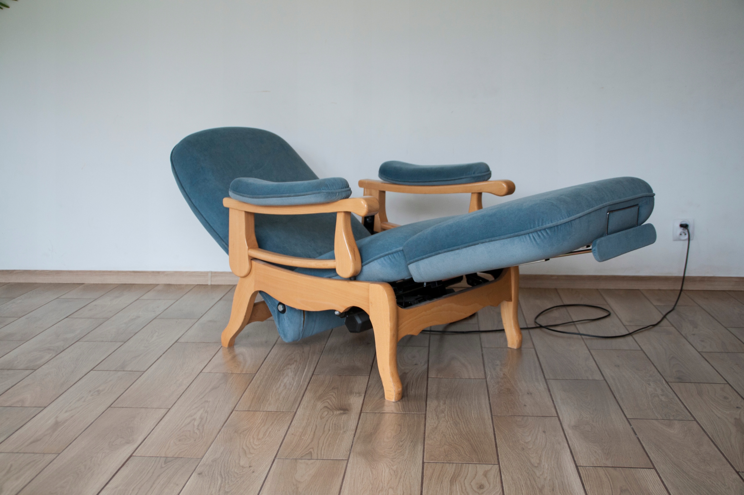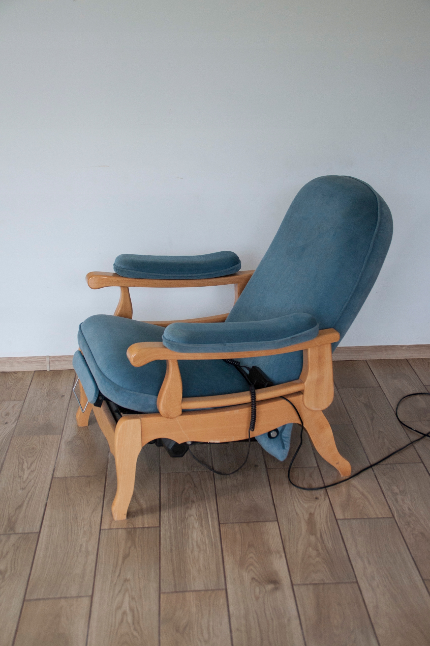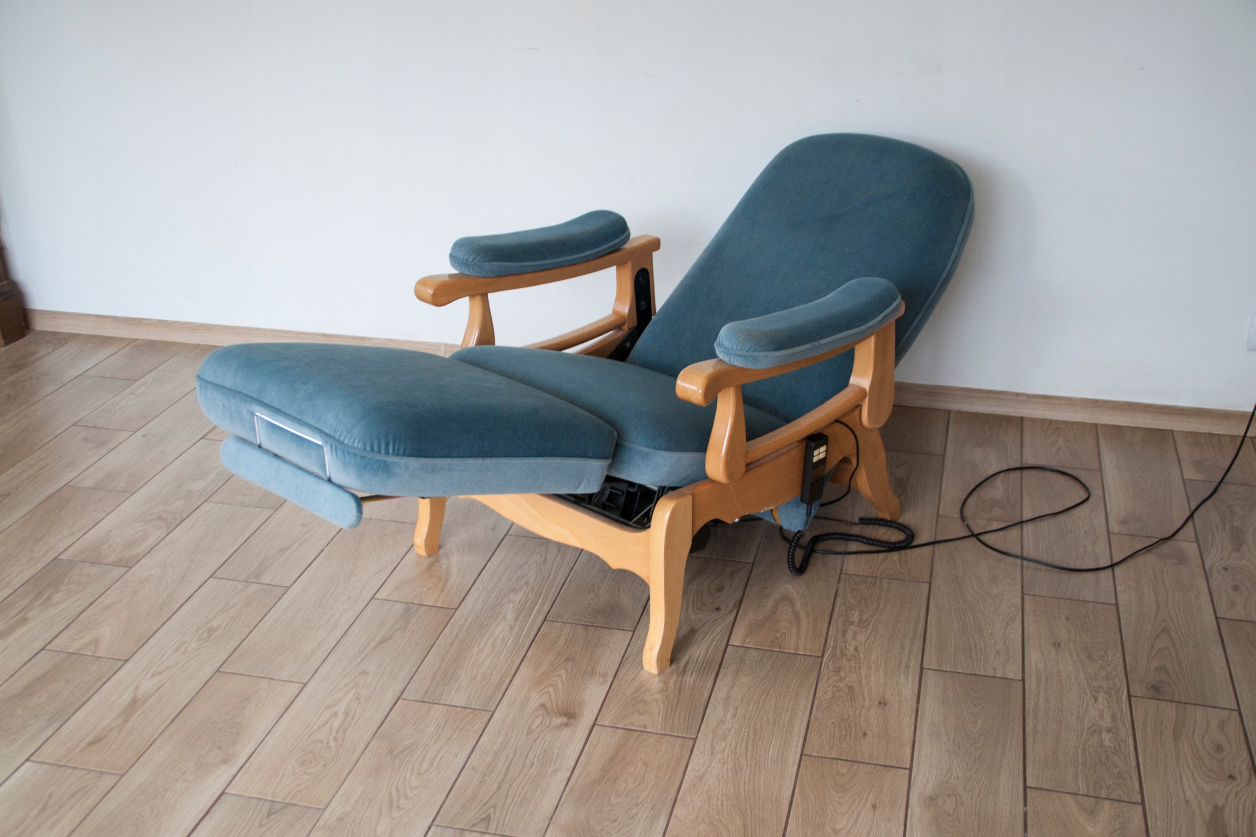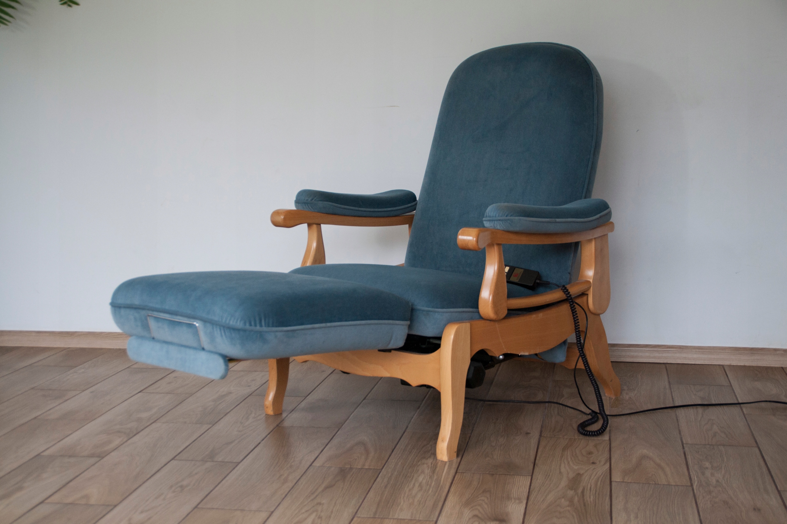 конструкція крісла дуже міцна і масивна, сидіння надзвичайно зручне. Крісло оброблене красивою оббивкою та має природні сліди використання, показані на фотографіях, які не впливають на його використання. Крісло розкладається за допомогою пульта дистанційного керування (можна зупинити в будь-якому положенні), а також має додаткову і дуже корисну функцію підйому підлокітників, що дає багато можливостей для позиціонування та налаштування крісла. Крісло може красиво виглядати в будь-якій кімнаті будинку: вітальні, кабінеті, спальні...