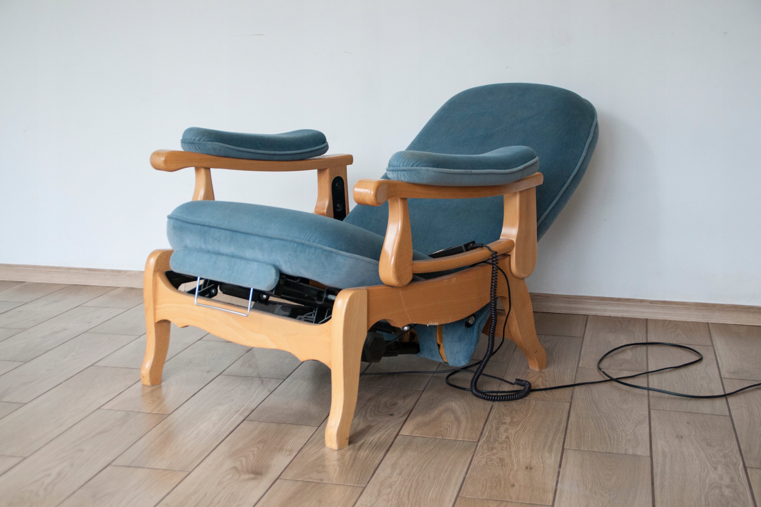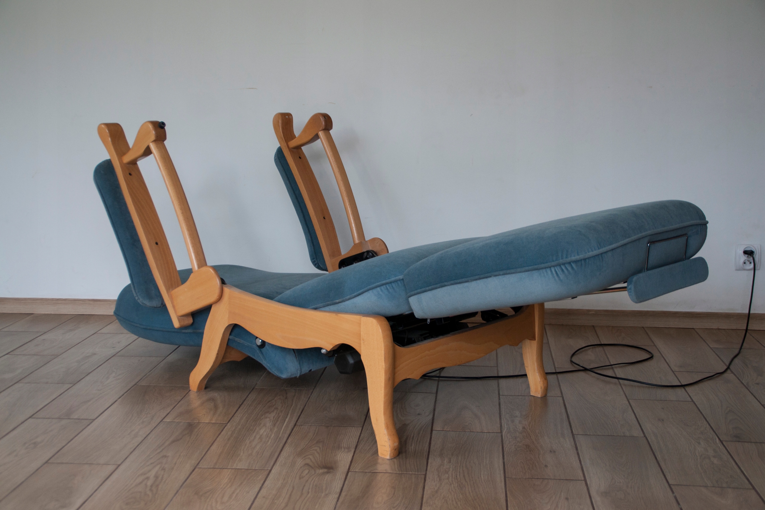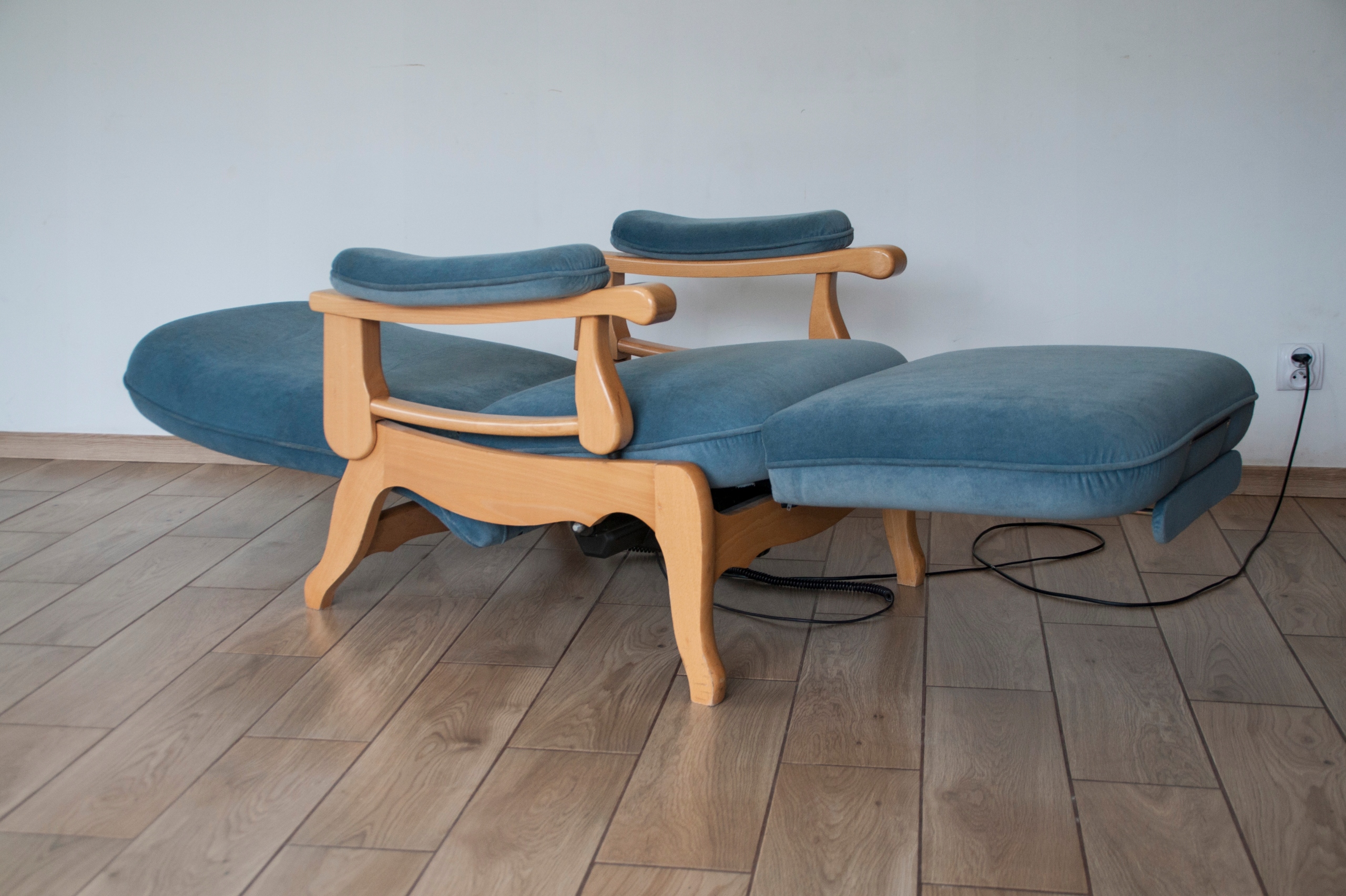 конструкція крісла дуже міцна і масивна, сидіння надзвичайно зручне. Крісло оброблене красивою оббивкою та має природні сліди використання, показані на фотографіях, які не впливають на його використання. Крісло розкладається за допомогою пульта дистанційного керування (можна зупинити в будь-якому положенні), а також має додаткову і дуже корисну функцію підйому підлокітників, що дає багато можливостей для позиціонування та налаштування крісла. Крісло може красиво виглядати в будь-якій кімнаті будинку: вітальні, кабінеті, спальні...