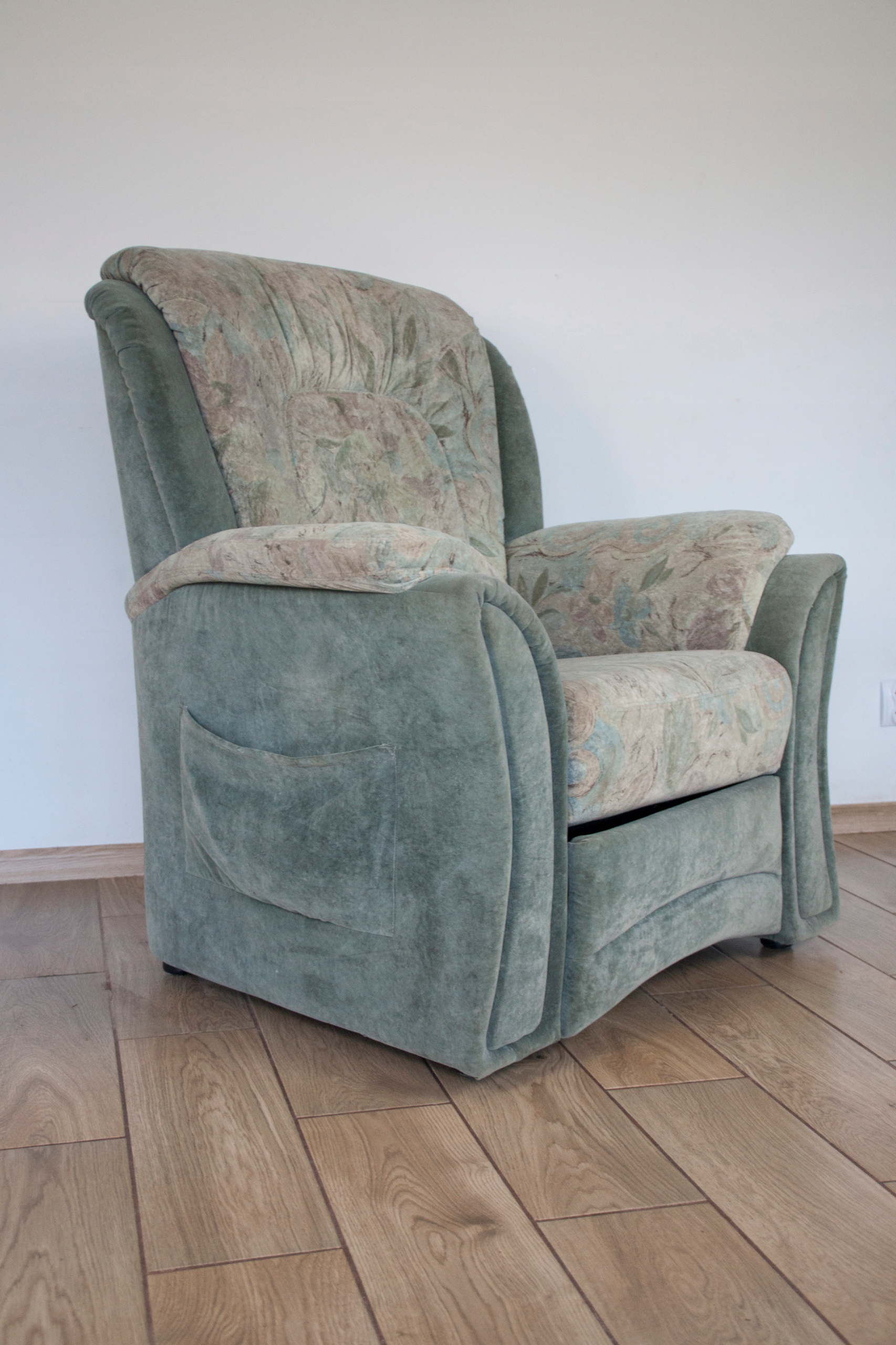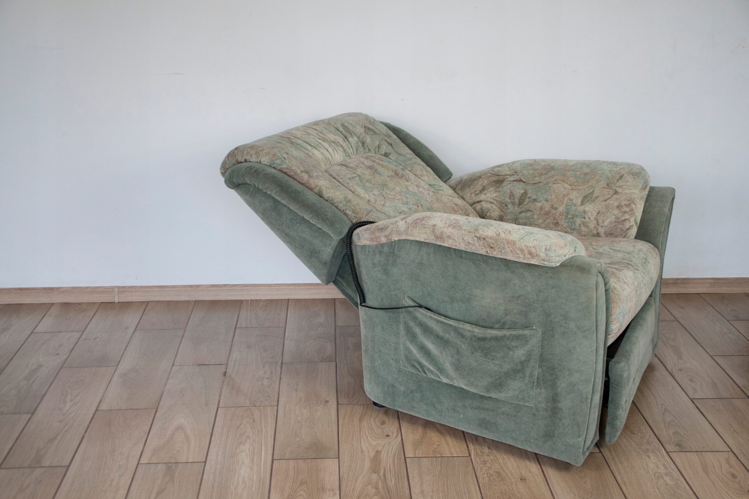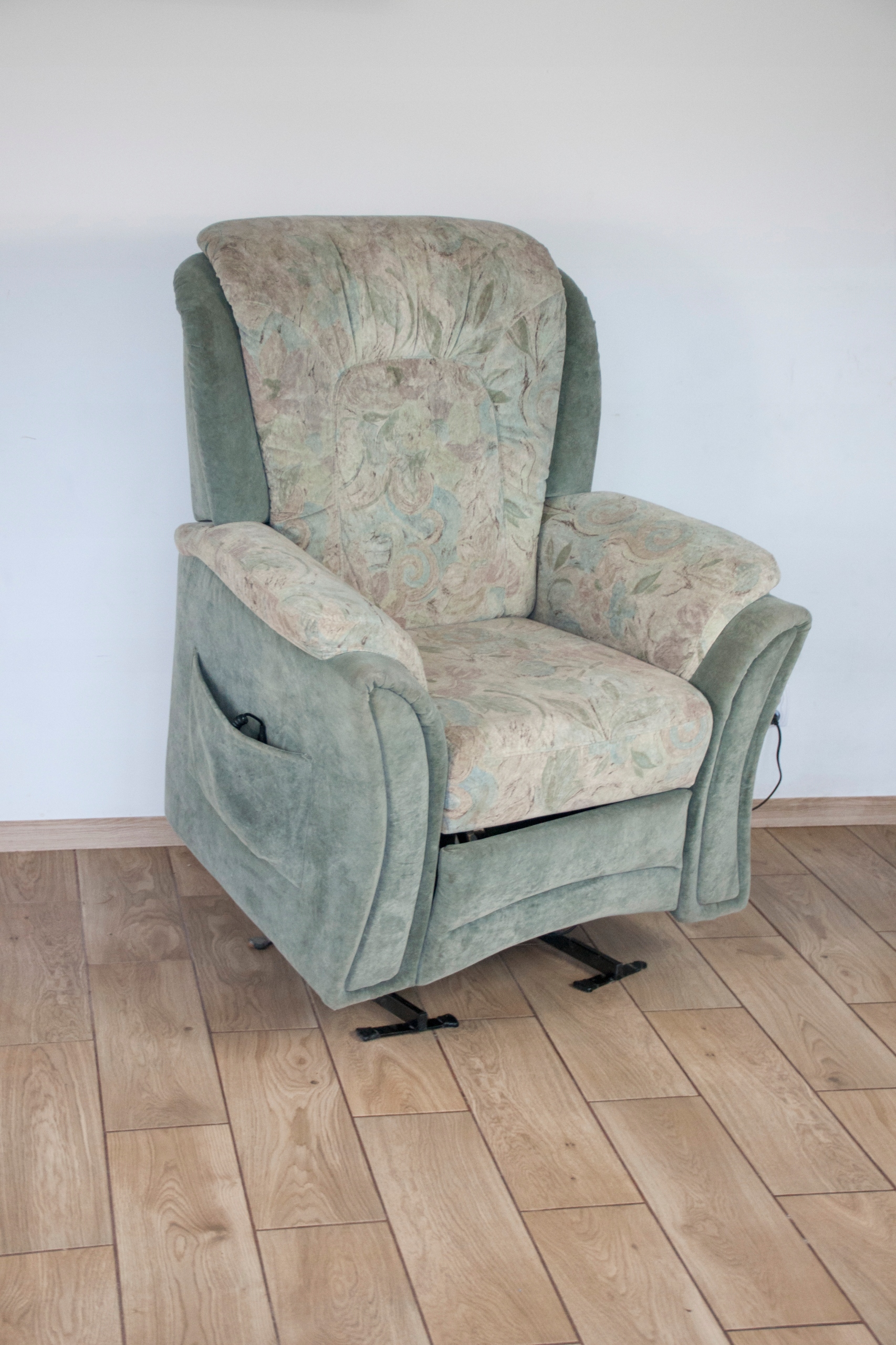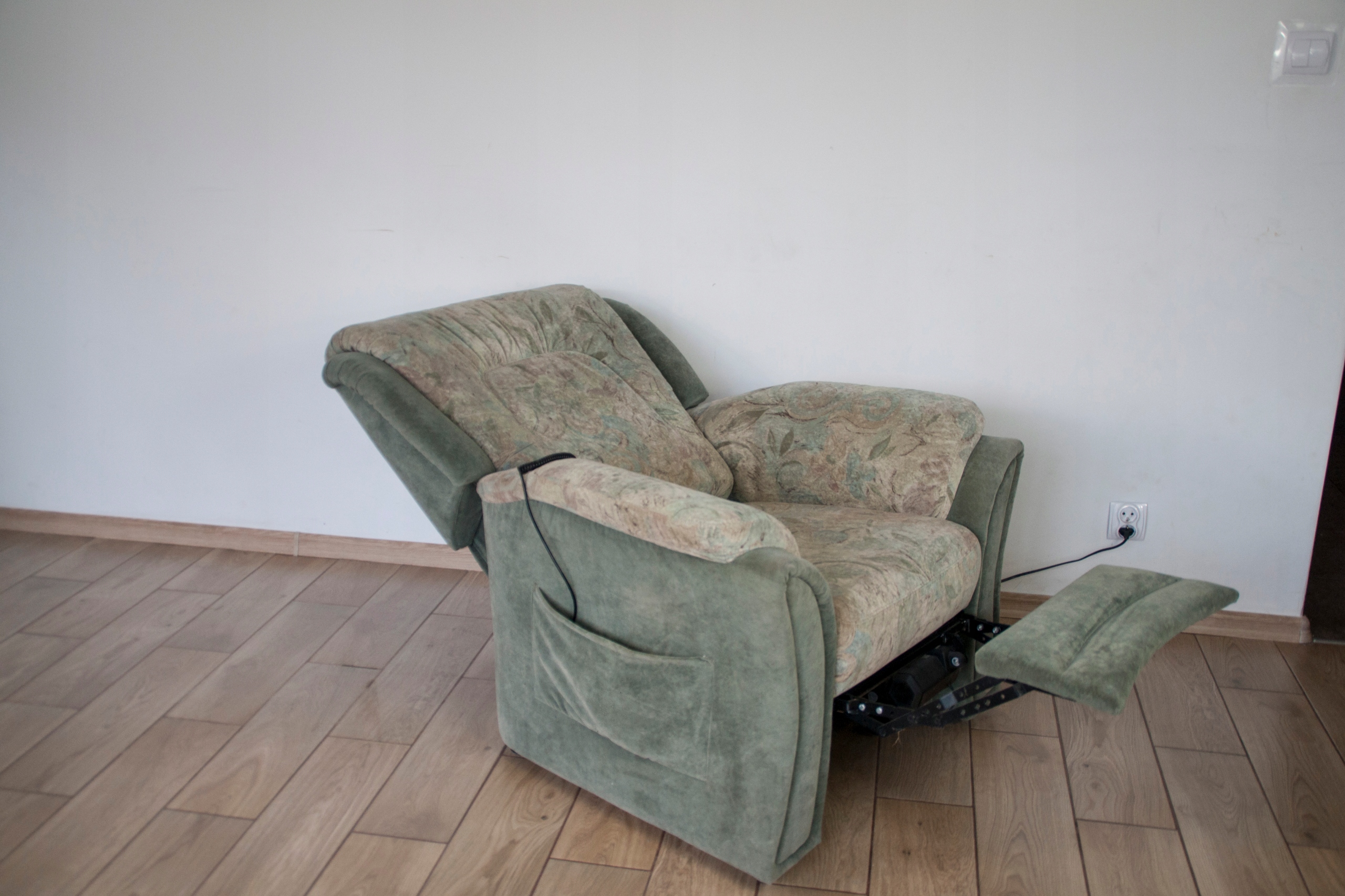 Конструкція крісла дуже міцна і масивна, сидіння виключно зручне. Крісло оброблене красивою оббивкою з природними слідами використання, які видно на фотографіях - невеликі потертості на підлокітниках і відділенні пульта. Крісло розкладається за допомогою дистанційного керування (можна зупинити в будь-якому положенні), а також має додаткову і дуже корисну функцію підйому, особливо для людей, яким важко встати після тривалого або коротшого відпочинку в положенні сидячи. Крісло може виглядати красиво в будь-якій кімнаті будинку: вітальні, кабінеті, спальні...
