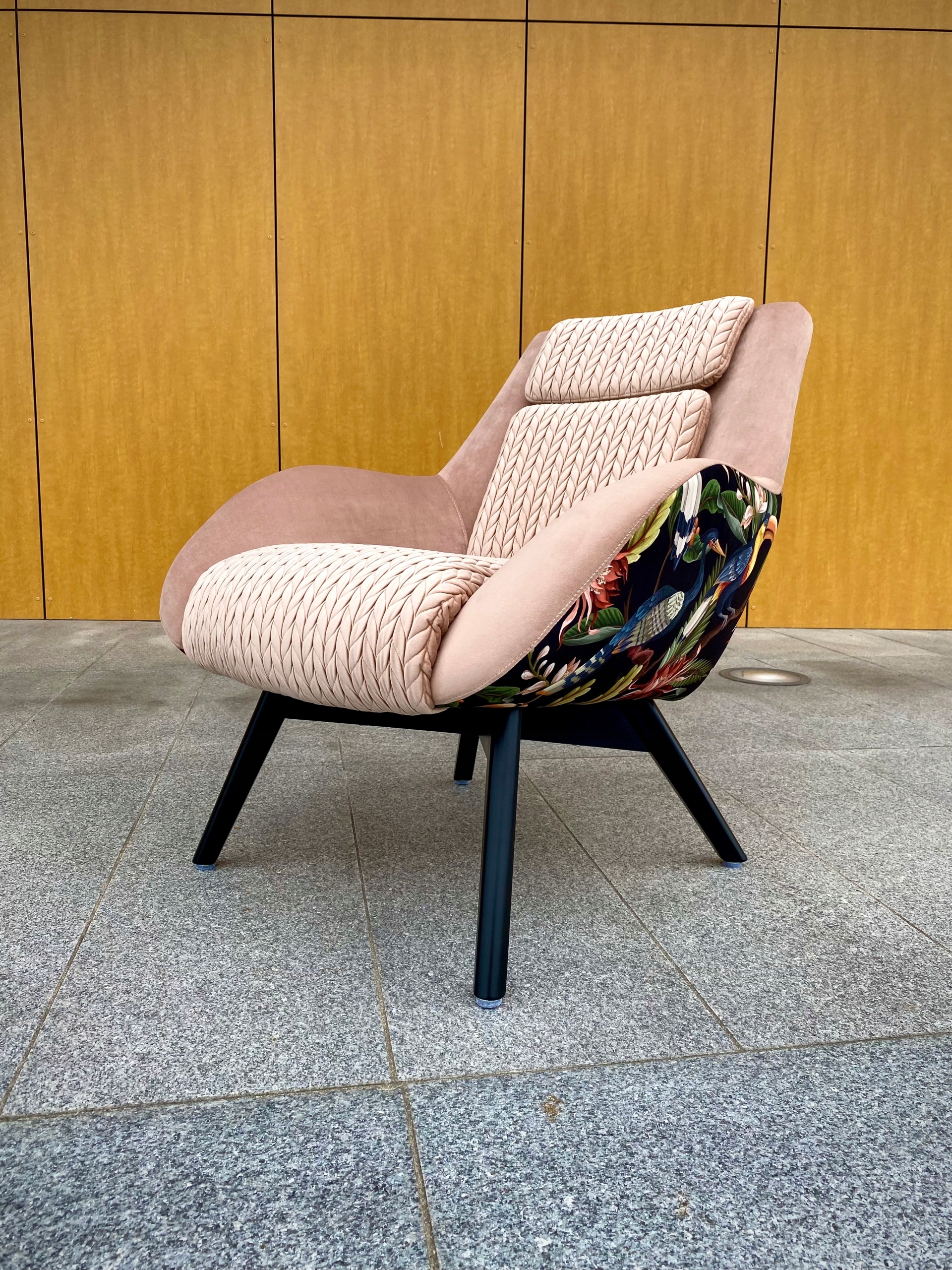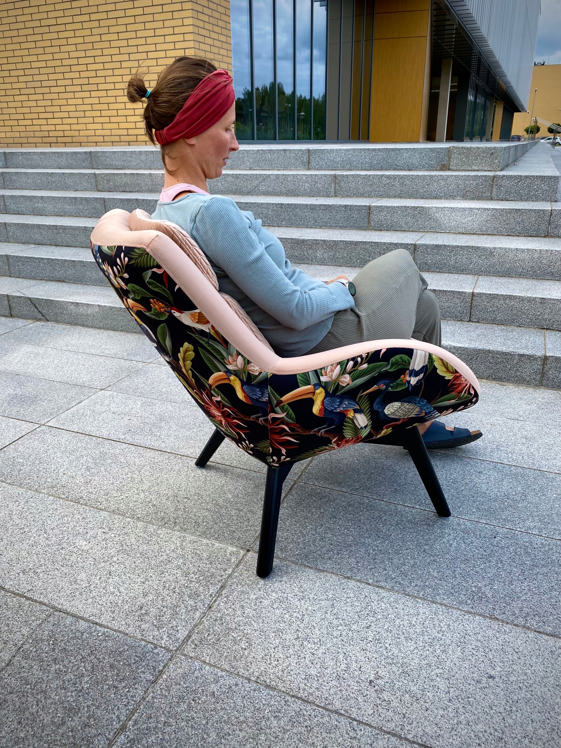 Крісло на основі фанерного каркасу, стилізованого під скандинавський стиль. Сидіння відкидається назад і оснащене незнімно вшитими подушками. Ідеально впишеться у вітальню, спальню та громадські інтер'єри, наприклад, кафе, бутиків.