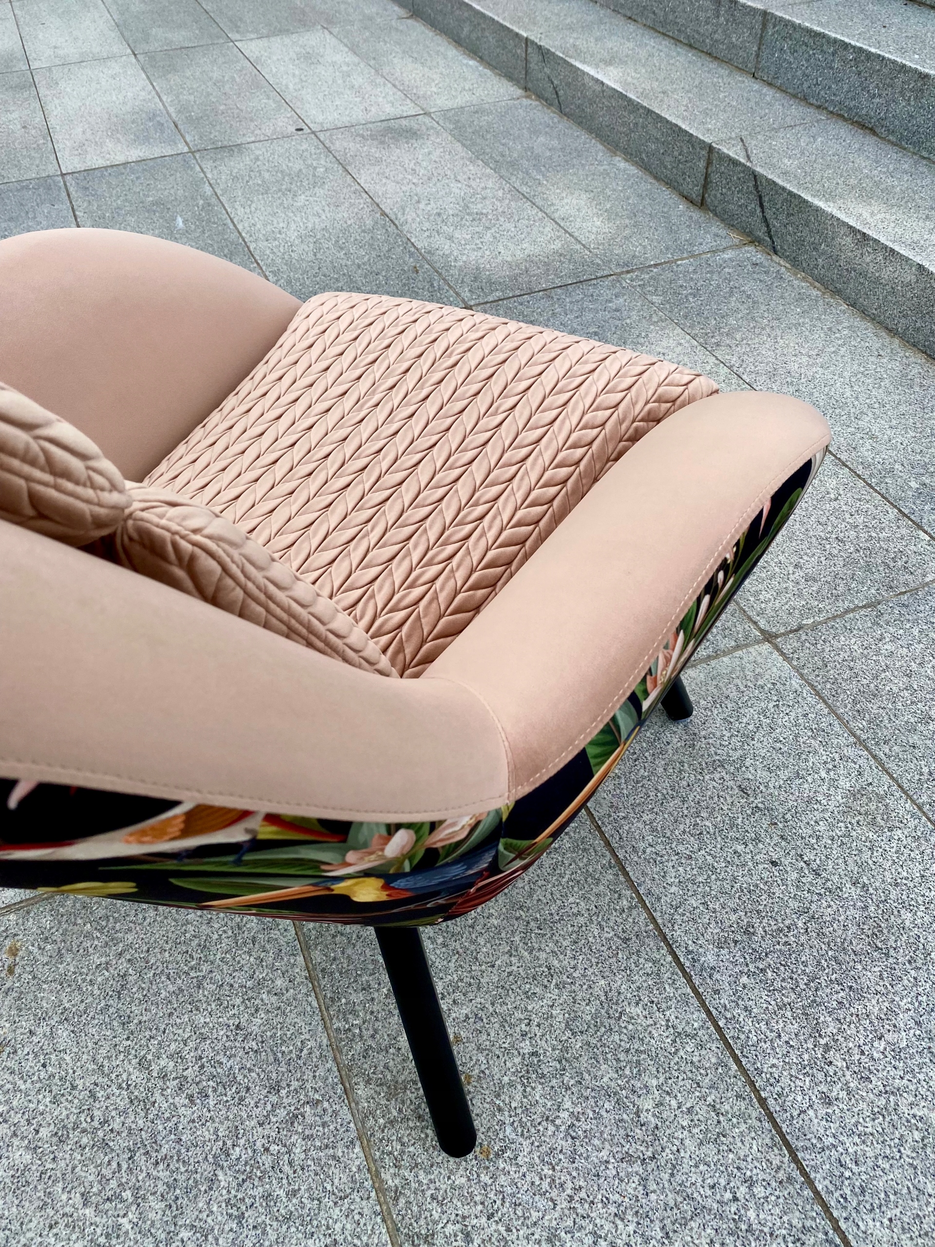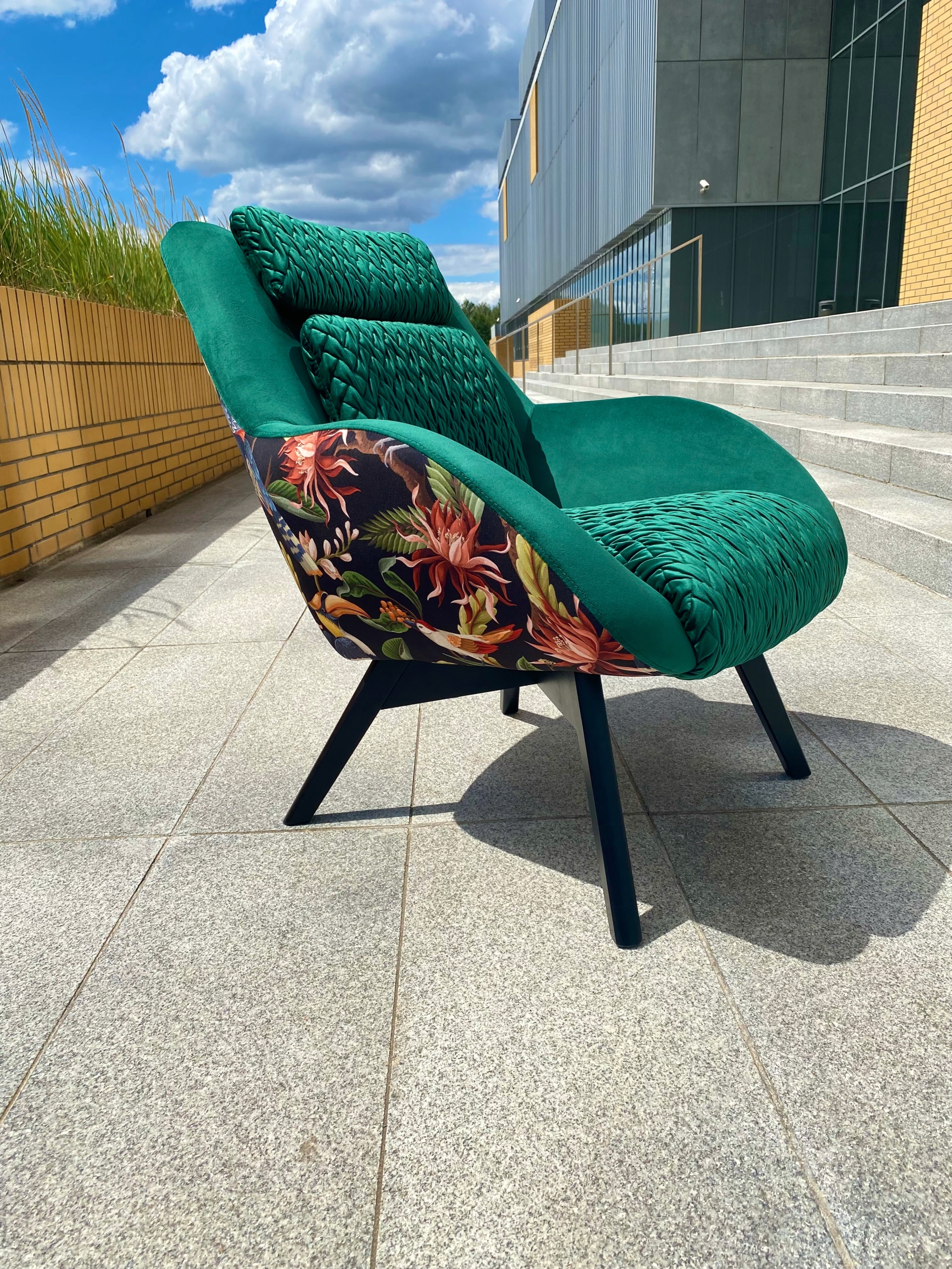 Крісло можна оббити будь-яким матеріалом на ваш вибір. Зразки матеріалів надсилаються у форматі PDF на електронну адресу, надану замовником, або їх можна завантажити з нижнього колонтитула в самому низу сторінки поширених запитань - Матеріали та фарбування деревини. Дерево (ніжки) можна пофарбувати в будь-який колір з нашої колірної палітри. Ніжки зібрати самостійно. Можна виготовити крісло на полозках-гойдалках (додаткова плата + 60 злотих) і виготовити підніжку для завершення комплекту (+350 злотих).