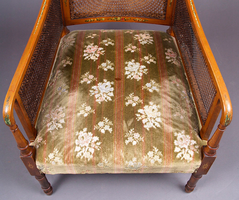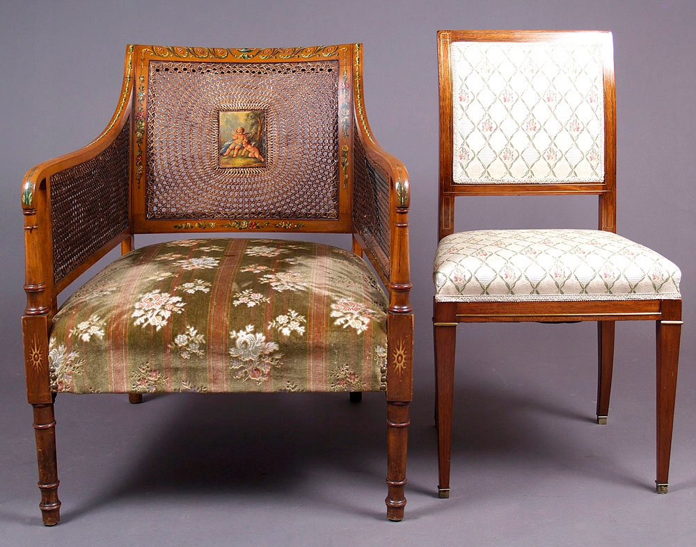 з вигнутими елементами каркасу, спинкою та боками, плетеними з рафії, та м’яким сидінням, що підтримується на чотирьох ніжках, повернуте спереду , задня шаблеподібна, є продовженням конструкції. Арочні опори спереду, що переходять у ніжки, з намальованими квітами, під ними витончені рамки з плетеною рафією ззовні та всередині. Спинка відкинута, профільована, вкрита одинарною рафією з мініатюрою в центрі із зображенням двох амурів на фоні дерев. Весь каркас спинки розписаний різнокольоровими квітами. Сидіння, оббите тканиною, з пружинами, прикріпленими до ременів внизу.