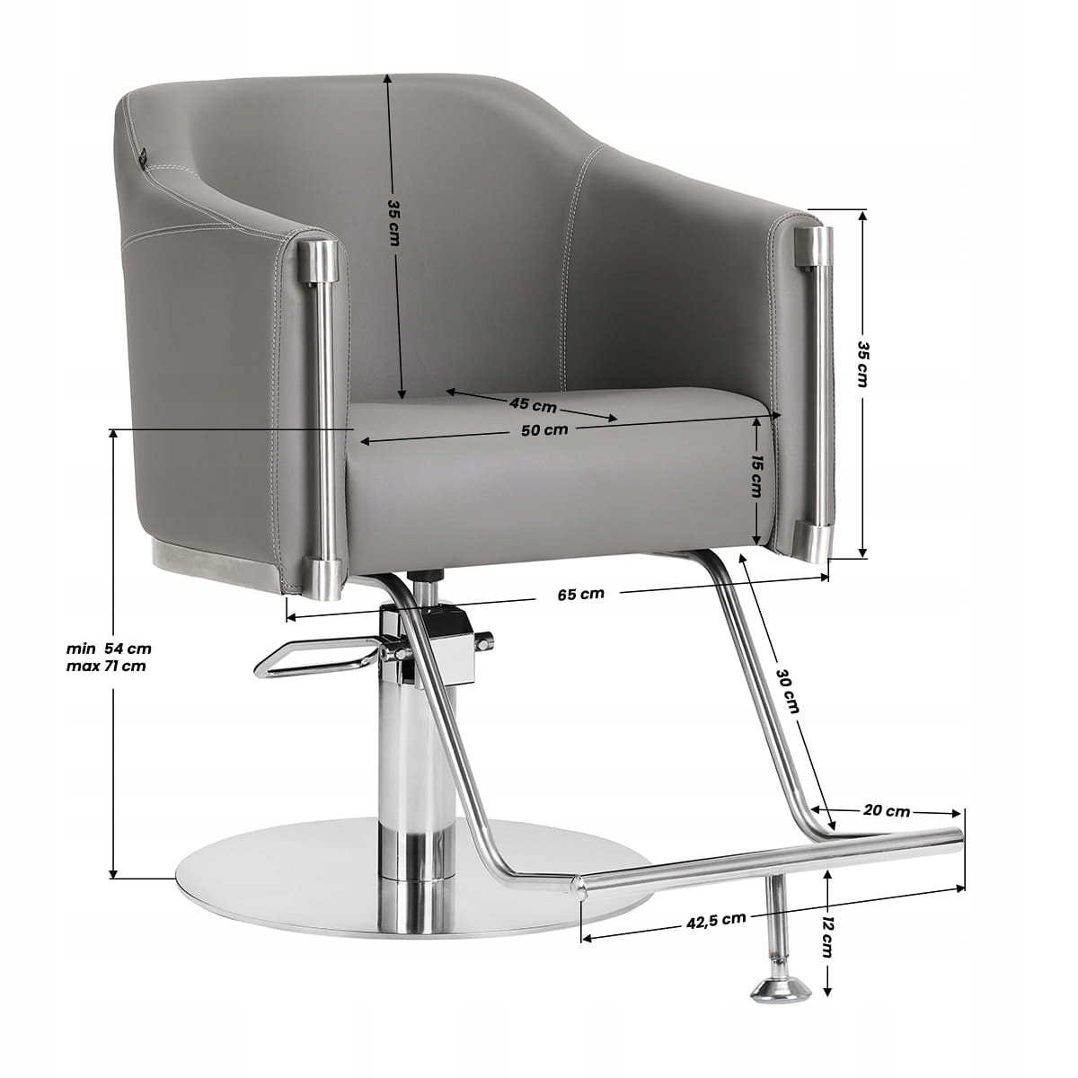 Стійкий гідравлічний підйомник дозволяє регулювати рівень сидіння в межах 54-71 см, навіть коли клієнт сидить на стільці.
