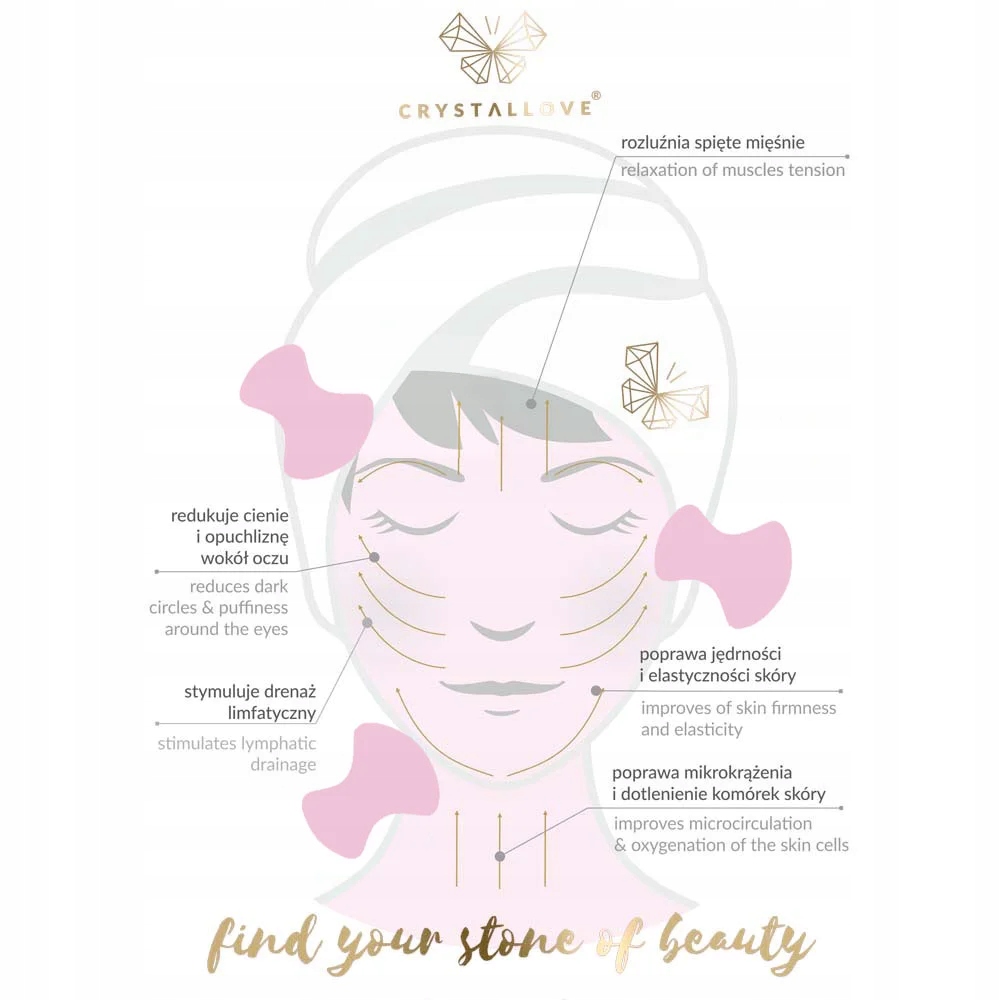 Масаж виконується на очищеній шкірі, покритої улюбленою олією або сироваткою. Ми починаємо з масажу шкіри навколо очей, масажуючи від внутрішньої до зовнішньої сторони обличчя, а потім переходимо до масажу шиї та розщеплення до лімфатичних вузлів. Ми повторюємо кожен рух 5-10 разів. Під час масажу пам’ятайте про легкі рухи та делікатний тиск. Хоча камінь має свій натуральний холод, гриб додатково охолоджується до того, як масаж у холодильнику дозволить отримати додатковий ефект для освіження шкіри. Однак, якщо ви хочете підтримати поглинання косметики глибоко в шкіру, занурюйте гриби в теплу воду на кілька хвилин до масажу.