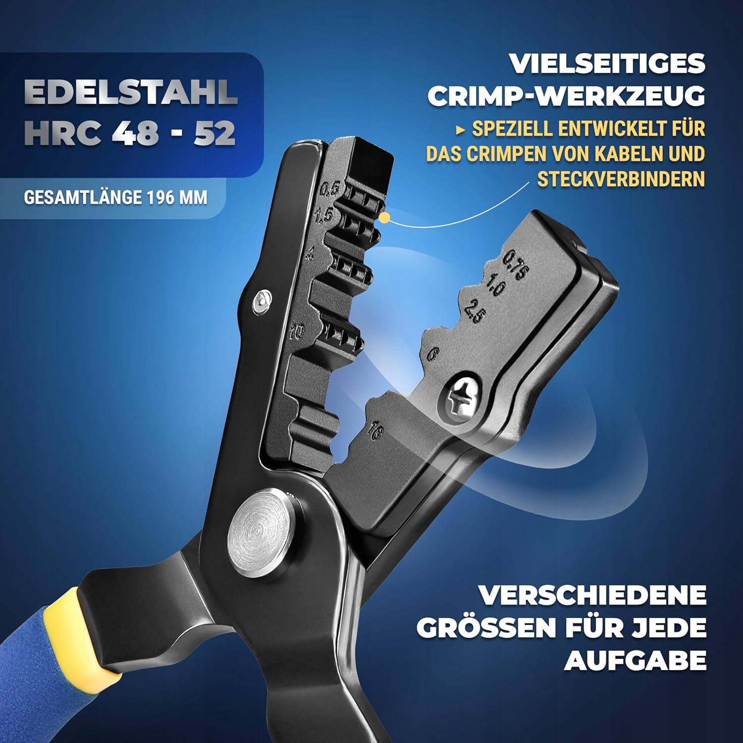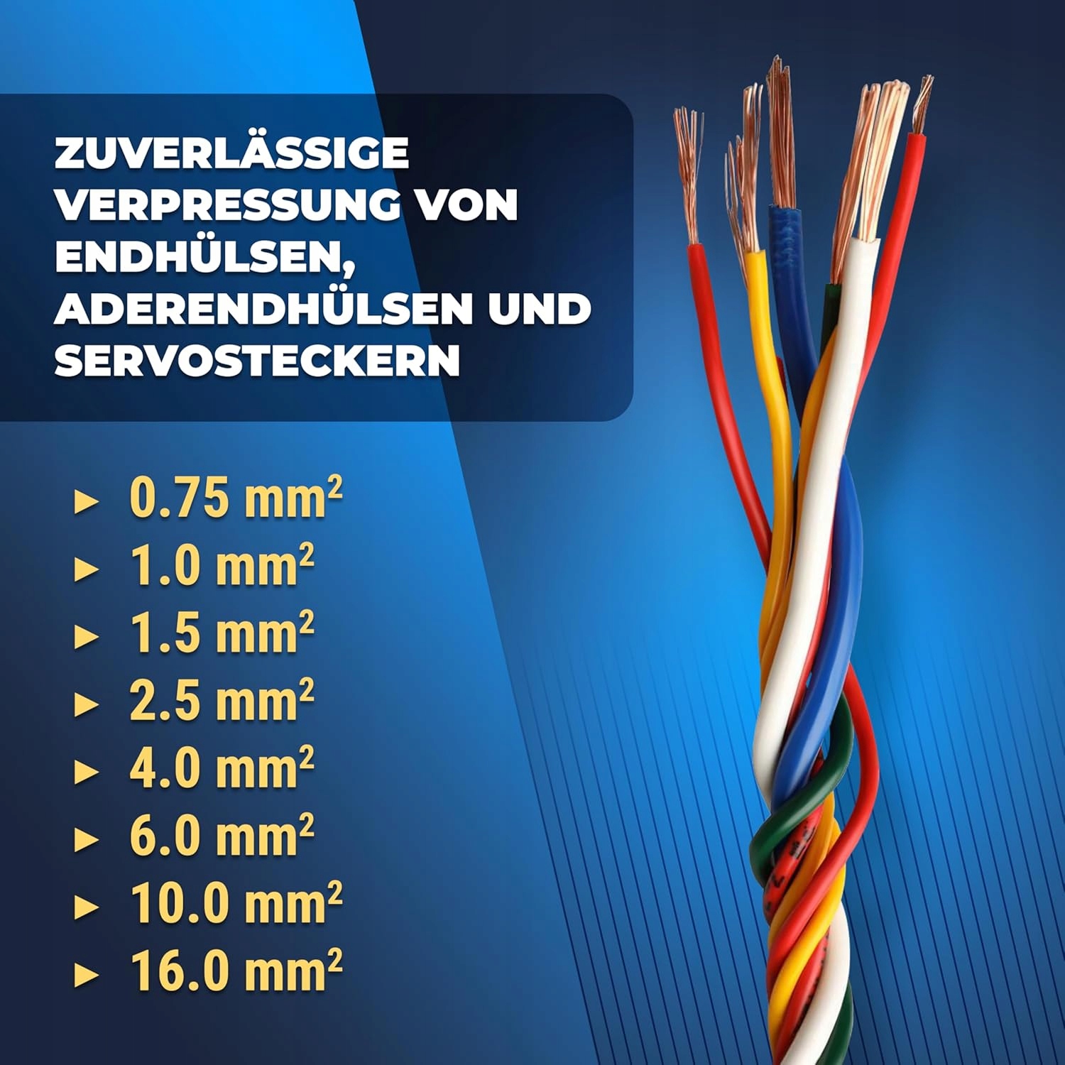 - Для замішених рукавів з розмірами 0,75-1,0-1,5-2,5-4,0-6,0-10,0-16,0 мм² з спеціальними бічними поверхнями для деяких утримуючих рукавів та кабелів