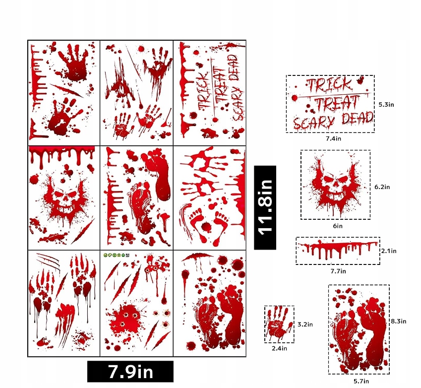 Цей набір містить аж 9 аркушів кривавих наклейок, що дає вам необмежені можливості прикраси. Ви можете створювати сцени з фільмів жахів, запечатувати вікна з кривавими смугами або створити власні жахливі історії на вікнах.