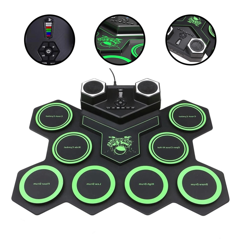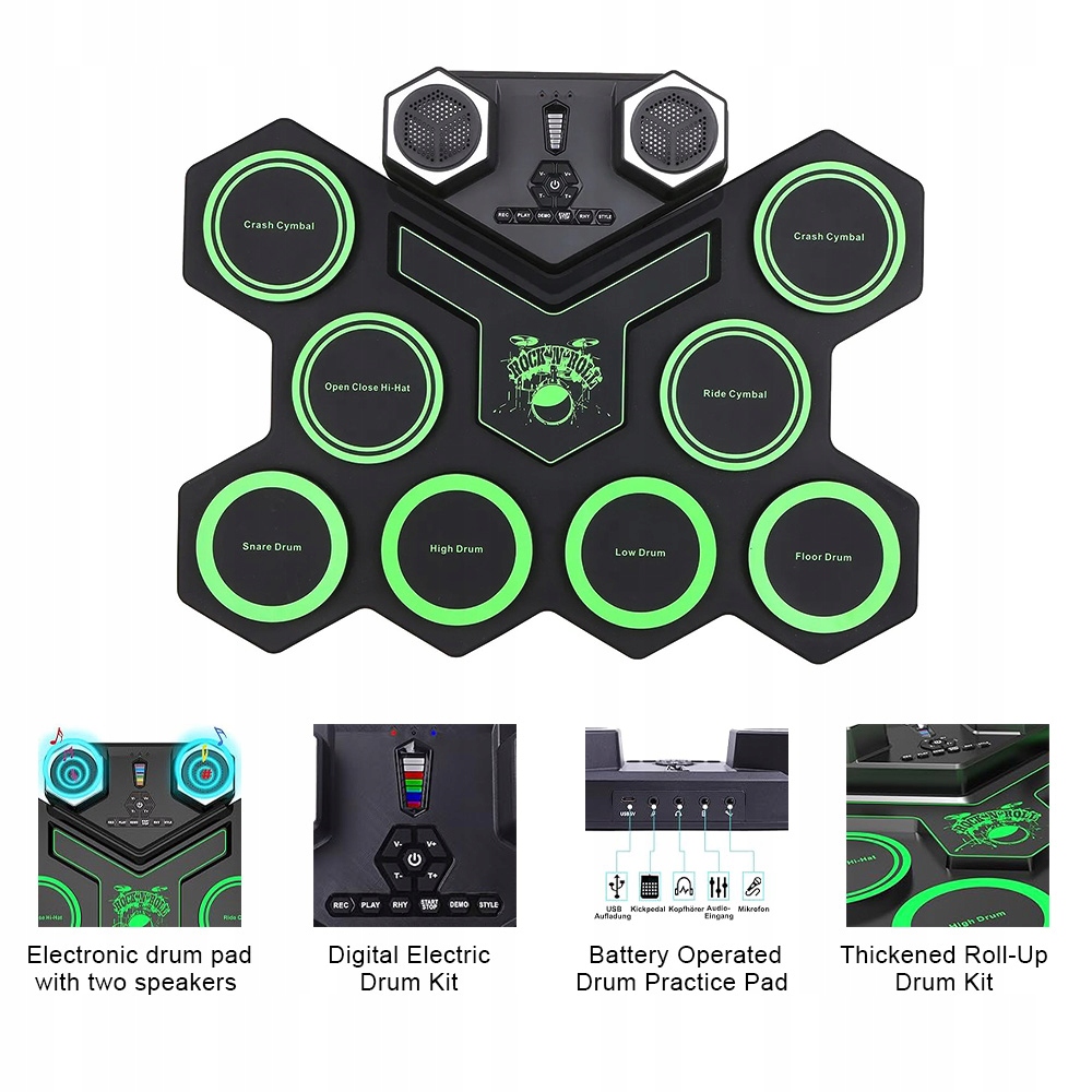 прокатні портативні барабани живляться від USB або акумулятора, портативного, згорнутого вгору Електронні барабани, які є чудовим інструментом для всіх Любителі ритмів, барабанщиків для початківців, а також людей, які Вони подорожують і не хочуть відмовлятися від можливості грати на барабанах. Обладнання Він ідеально підходить для навчання та гри. Це дозволяє розробити відповідні рухові звички, пов'язані з триманням та рухом паличок, а також ритмічними.