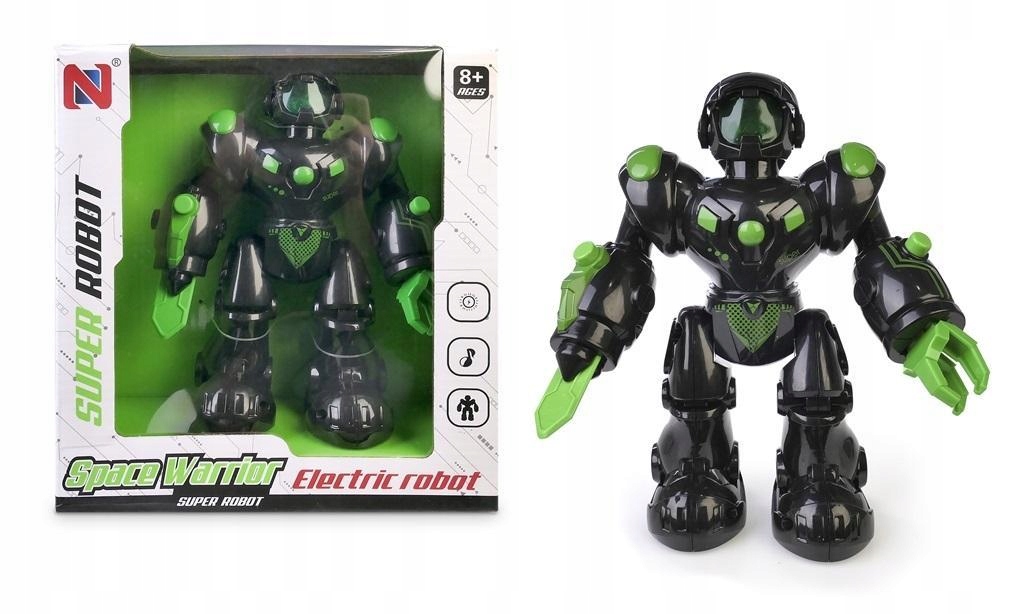 Функції: рух вперед, видає звуки куль, 2 кнопки на руках, що відповідають за рух захоплення, світлові ефекти, Інша інформація: висота робота 18 см, розміри. упаковка 22 х 20,5 х 8 см, 3 батареї AAA не входять, 3+