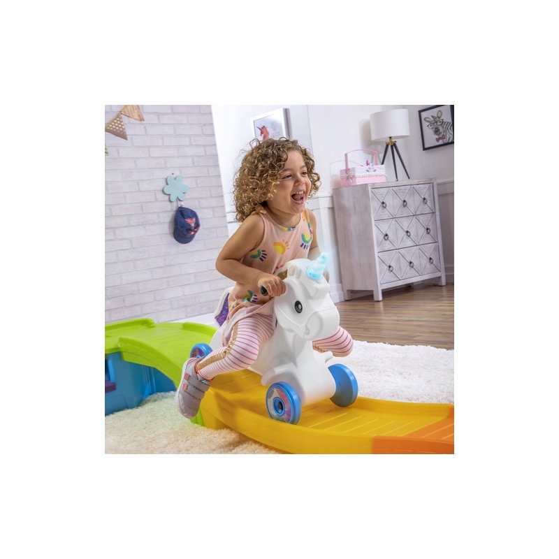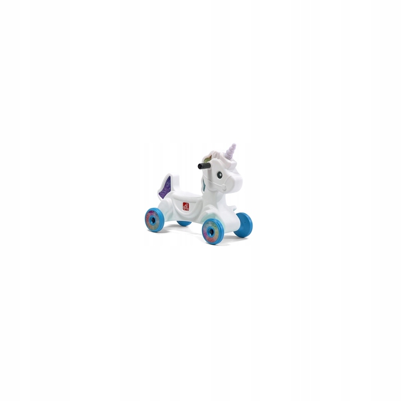 Черга прикрашена красивими яскравими стікерами. Його також можна використовувати самостійно як поїздку. - Єдиноріг видає звук під час катання, а його гудок світиться - це робить гру дитини більш привабливою