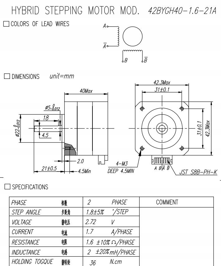 Параметри двигуна стандартизовані та відповідають загальноприйнятій моделі Nema 42 (Nema 17).