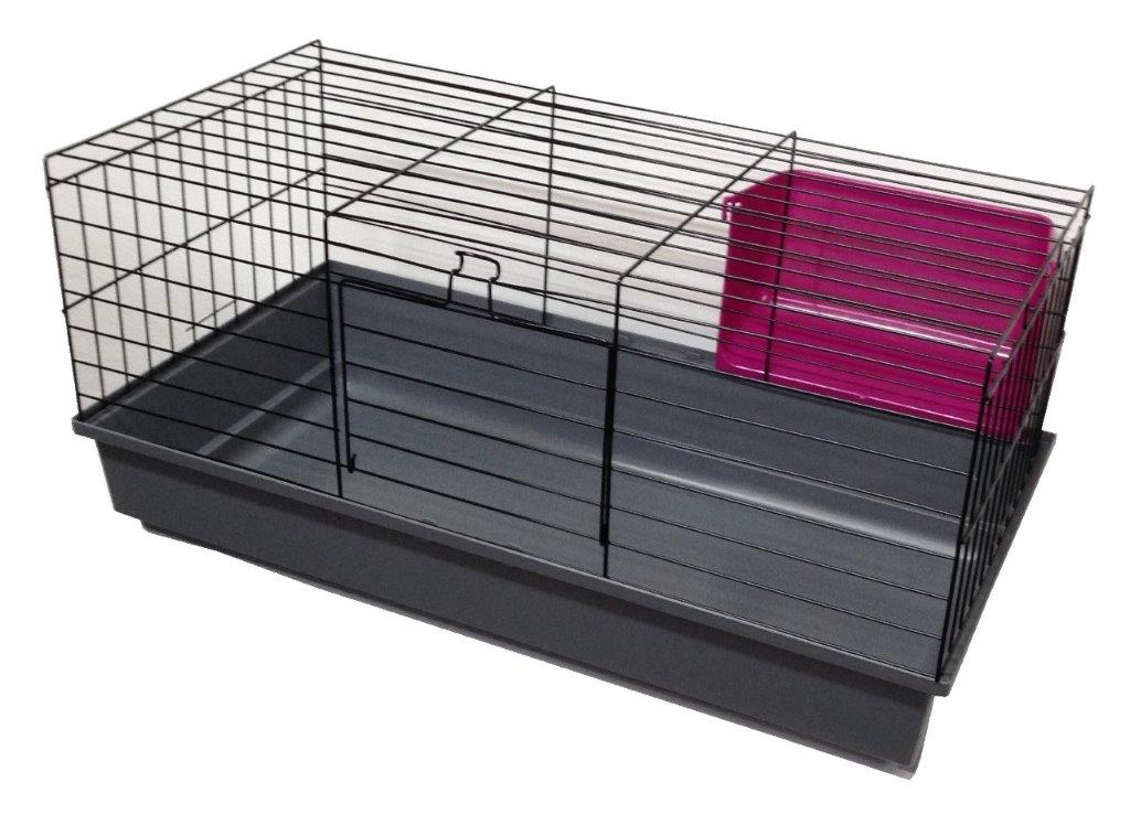 Клітка призначена для кроликів і морських свинок, має великі передні двері для входу і зовнішню годівницю для сіна.