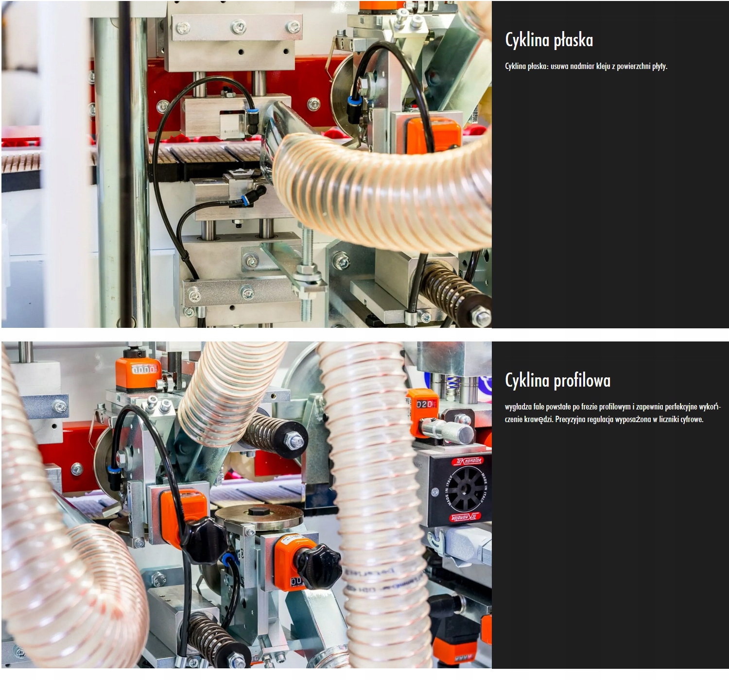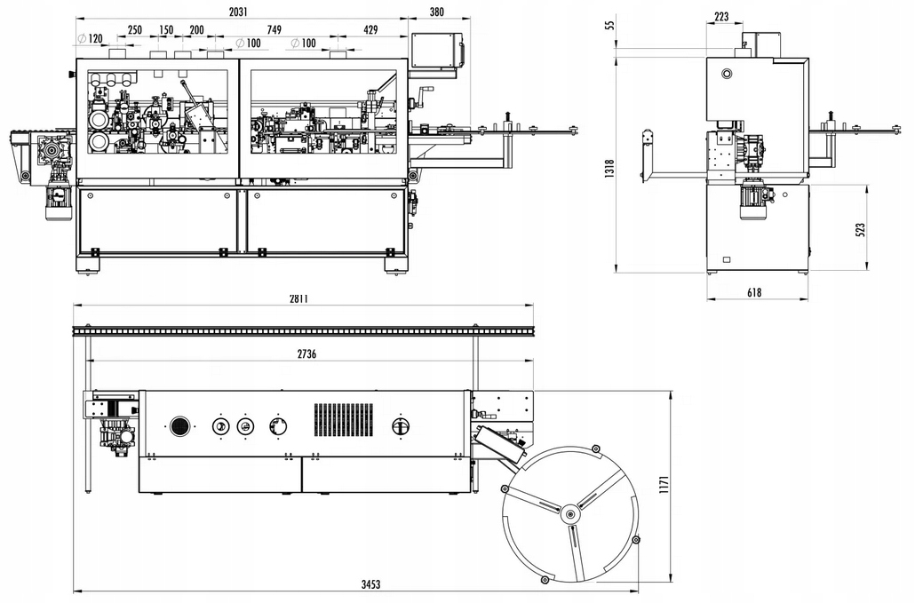 Одностороння вузька кромкооблицювальна машина з блоком попереднього фрезерування плит, дозатором клею для плит, машиною поперечного різання, фрезеруванням кромок, транспортним ланцюгом і верхнім тиском валика та висувною боковою опорою елементів.