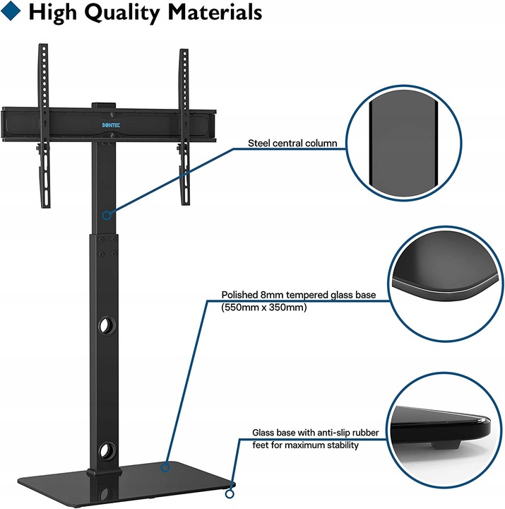 - Полиця із загартованого скла. Окрема підставка для телевізора має основу із полірованого загартованого скла товщиною 8 мм і має вантажопідйомність 60 кг для розміщення аксесуарів AV, таких як Blu-ray DVD-програвачі, звукові панелі, супутникові консолі тощо.