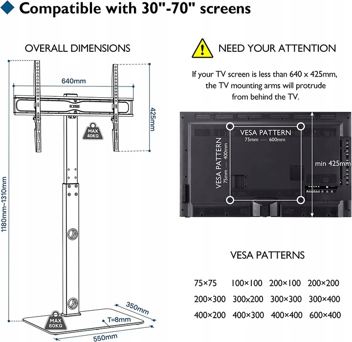 - Сумісність - підходить для телевізорів з діагоналлю від 30 до 70 дюймів з максимальним навантаженням 40 кг; Сумісність із шаблонами VESA 75x75/100x100/200x100/200x200/200x300/300x300/300x400/400x200/400x300/400x400/600x400 мм; Сумісні телевізори таких брендів, як Samsung, LG, Sony, Panasonic, Toshiba, Sharp, Mitsubishi, Sanyo, JVC, Logik, Digihome, Technika LCD LED OLED QLED Plasma TVs
