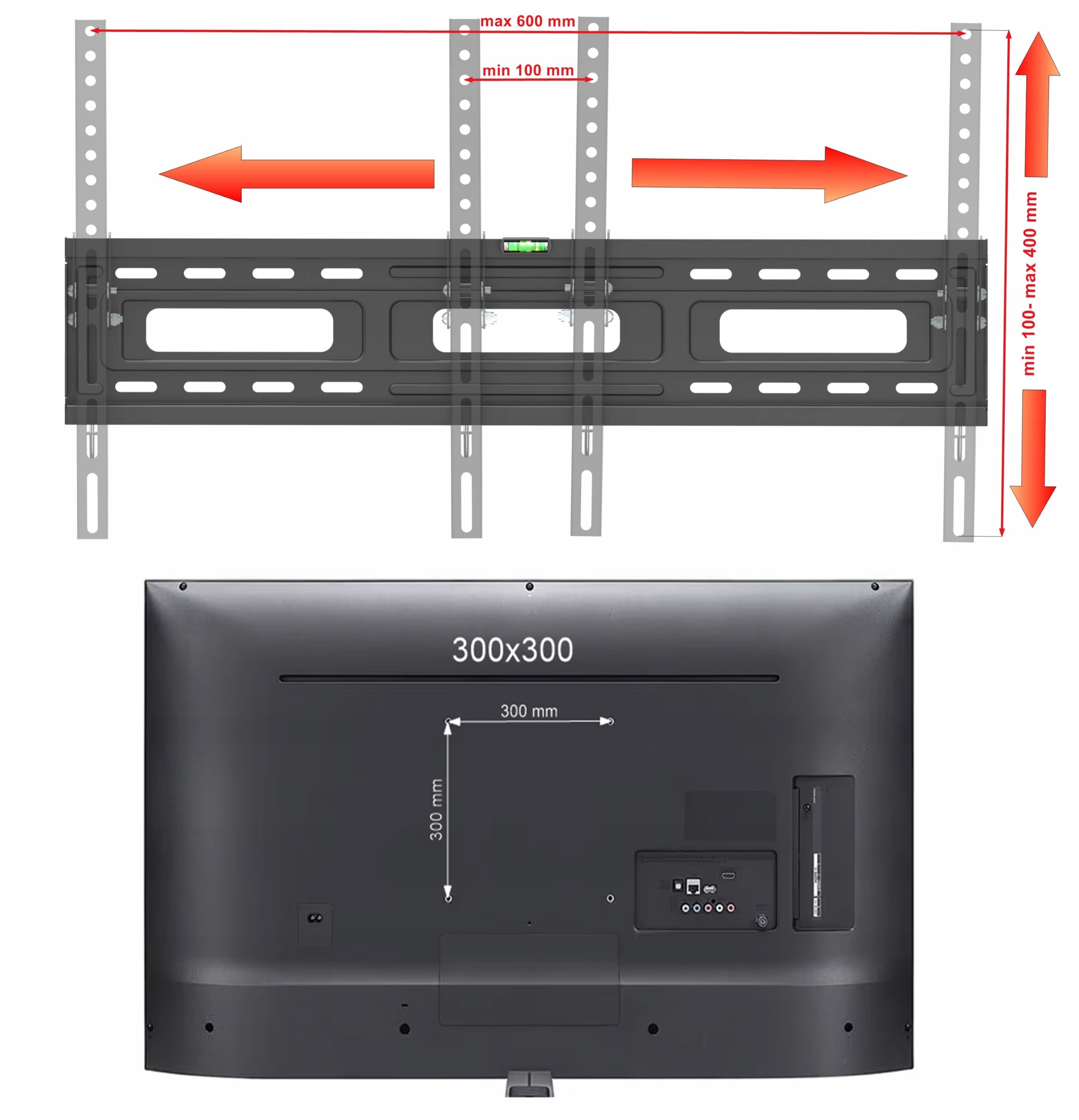 - ✅тримач є універсальним і може бути використаний для встановлення телевізорів усіх найпопулярніших брендів, які мають відстань між отворами для кріплення VESA: 100X100, 200x100, 200x200, 200x400, 300x200, 300x300, 400x200, 300x400, 400x300, 400x400, 500x400, 600x200, 600x300, 600x 400 мм і всі проміжні розміри та вага до 60 кг