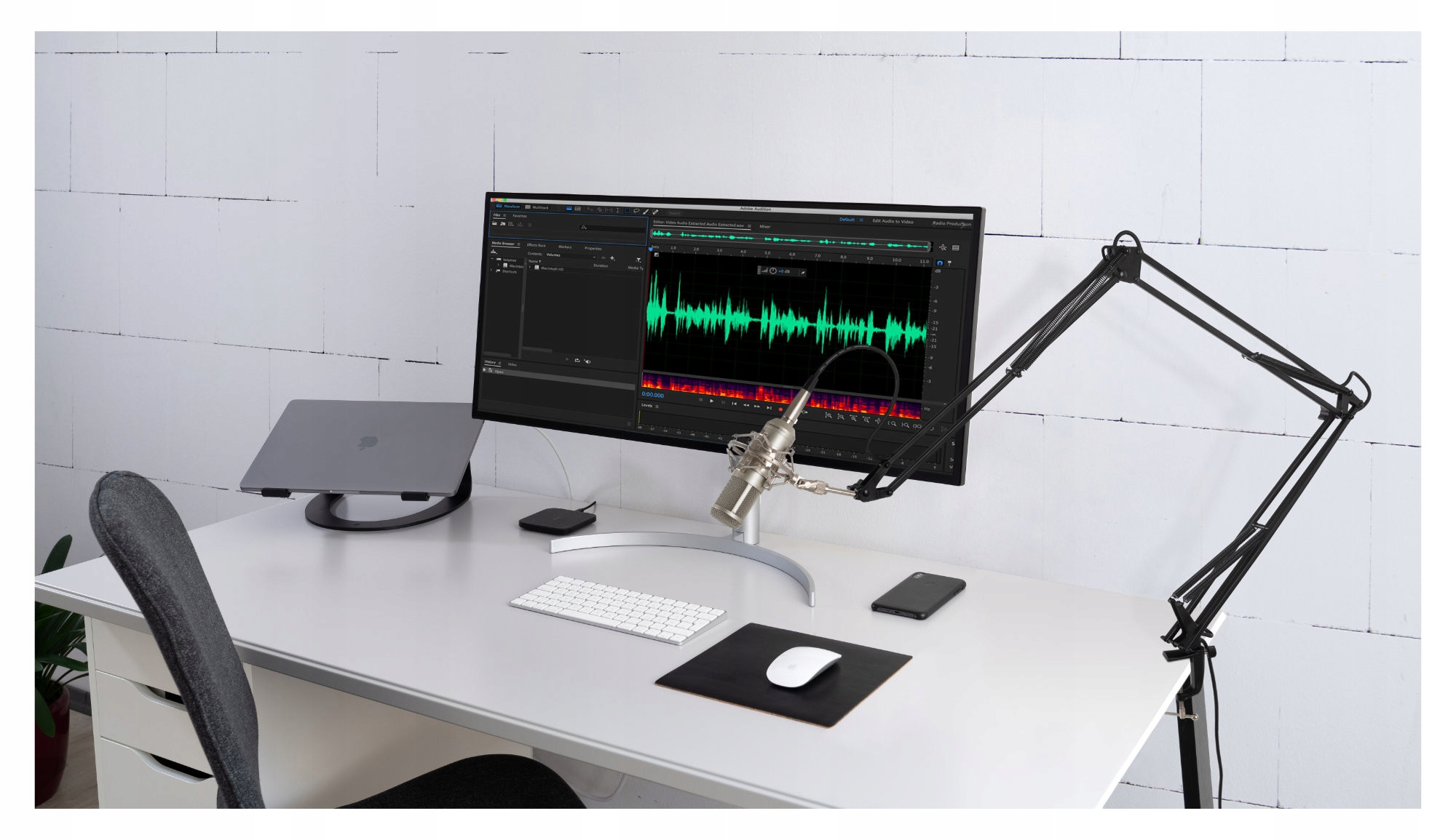 Мікрофонна рука з суцільною чорною структурою. Довжина повністю розтягнутої руки становить 1,50 м, довжина однієї гнучкої частини 50 см (3 х), максимальна ширина кріплення 56 мм. 5/8 Мікрофонного з'єднання, вбудований стабільний стіл.