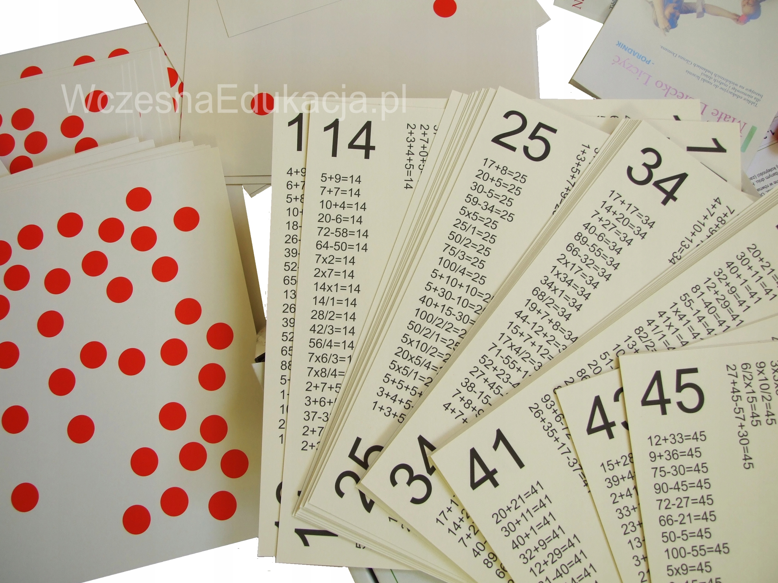 Початок гри в математику – це вивчення величин на абстрактному елементі, наприклад точці. Він повинен бути досить великим, щоб дитина могла звернути на нього увагу. Набір Math-Dots містить 101 картку з крапками та одну додаткову картку. На звороті кожної картки є 20 дій, які призводять до кількості крапок на передній частині цієї картки. Розмір картки згідно з рекомендаціями методики: 28 на 28 см, червоний принт, дуже жорсткий папір.