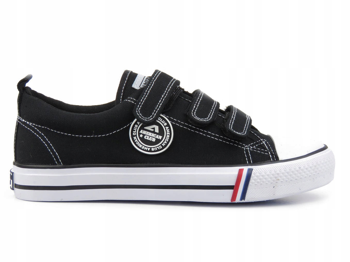 Молодіжні кросівки American Club виготовлені з тканини універсального чорного кольору. . Підкладка і вставка також оброблені тканиною. Завдяки трьом липучкам можна регулювати ширину взуття. Це рішення також дозволяє швидко і комфортно взуватися. Гумовий носок ефективно захищає пальці і захищає від стирання. Товста гумова підошва добре зчіплюється з землею.