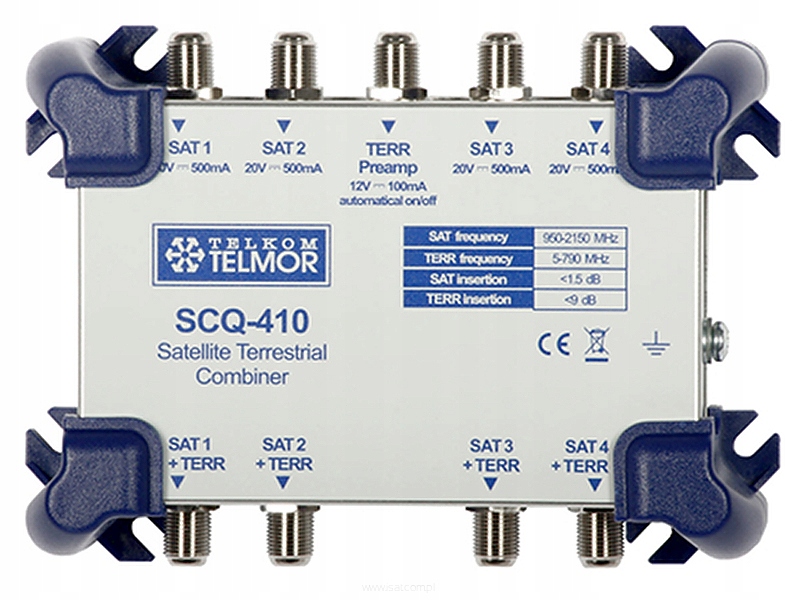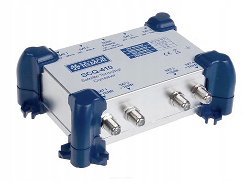 Об'єднувач/кросовер Telmor SCQ-410 для сигналів RTV (DAB/DVB-T) і SAT дозволяє надсилати комбінований сигнал через один коаксіальний кабель до точки прийому: супутникового тюнера та Т-приймача.