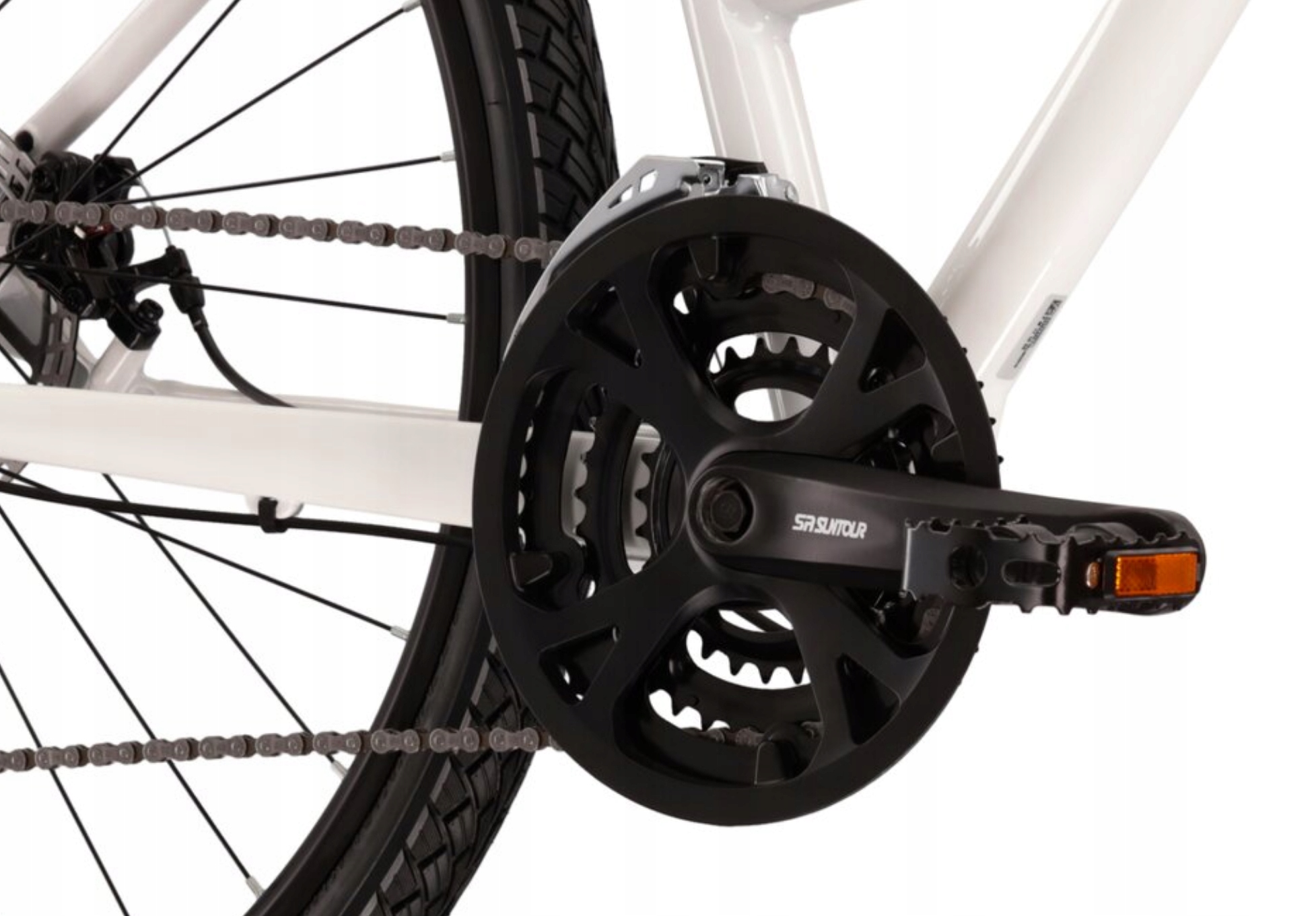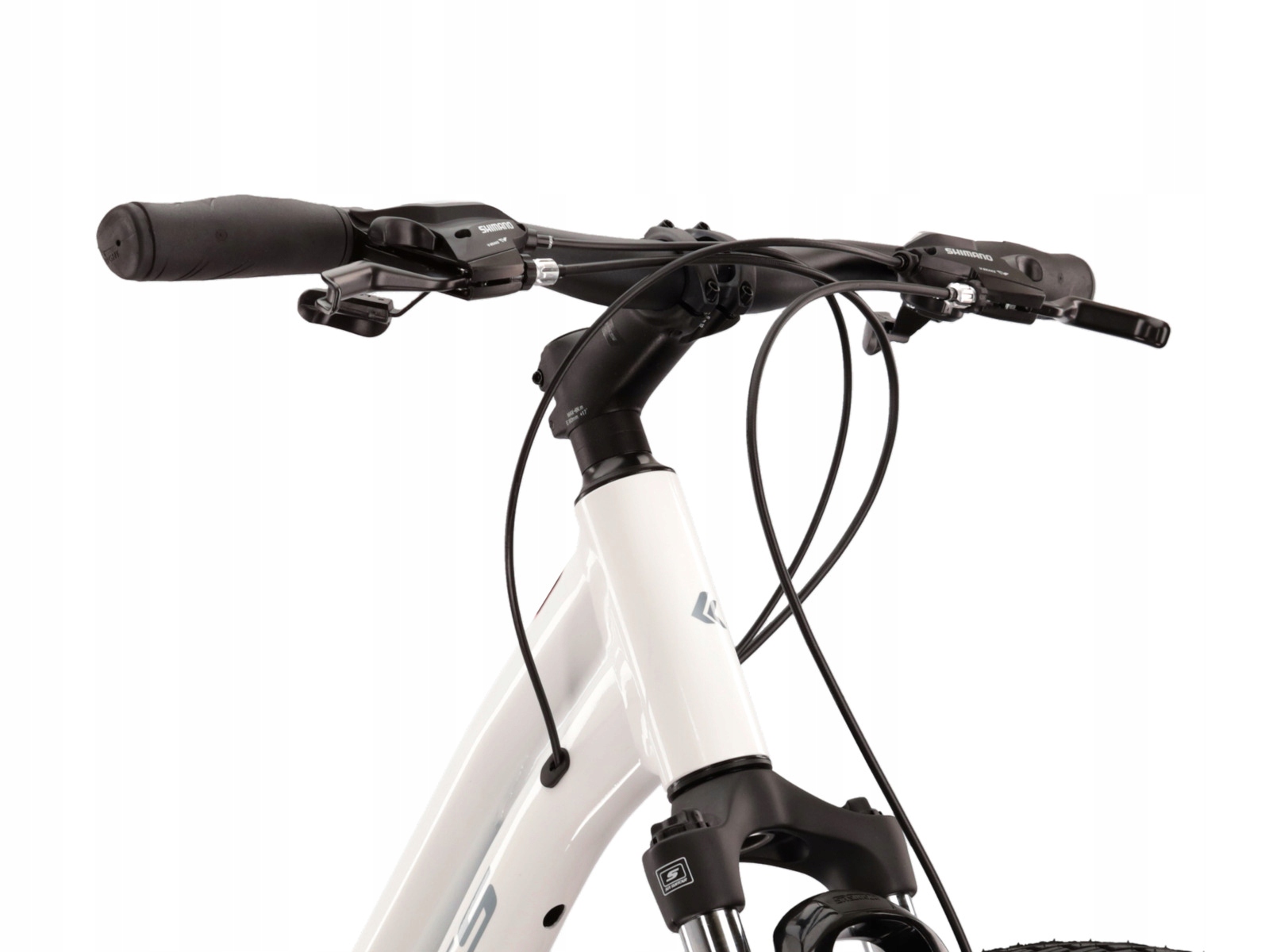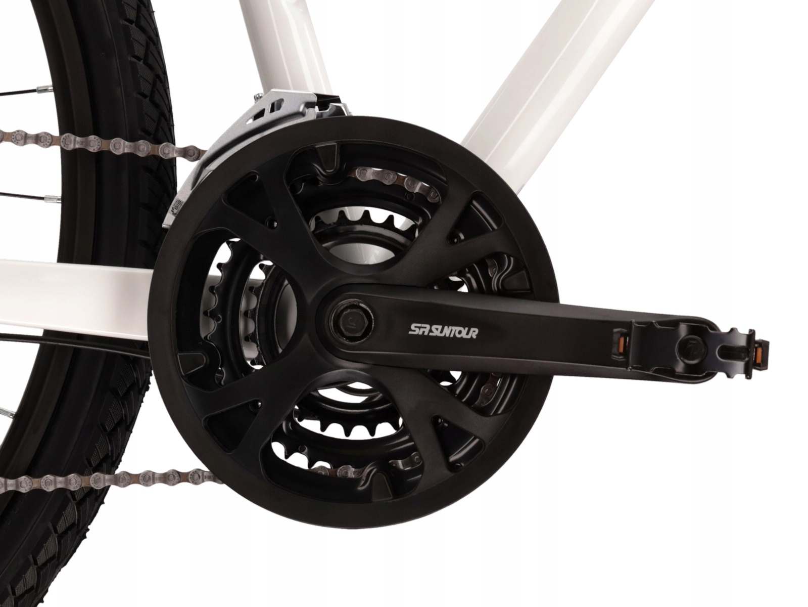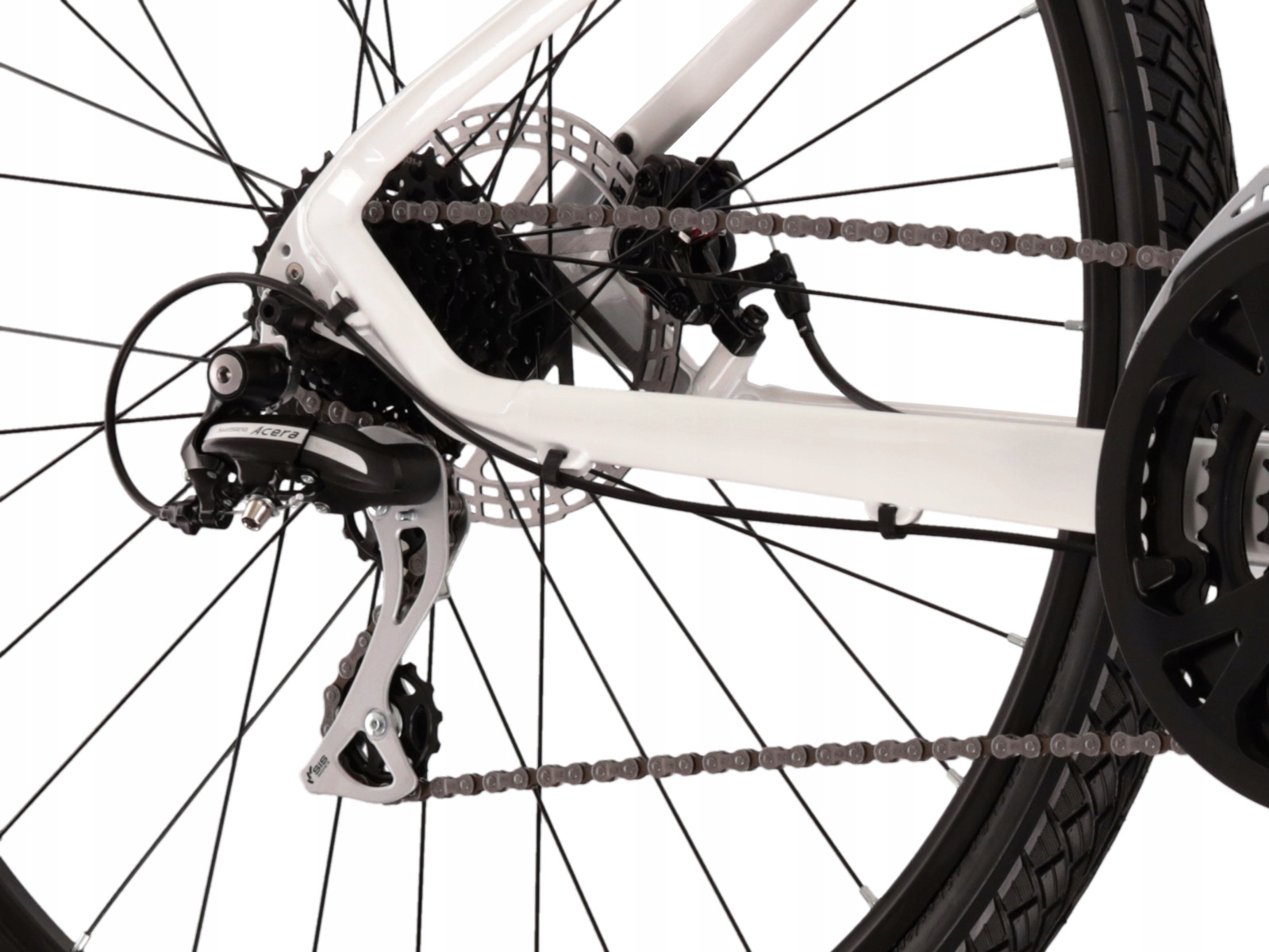 KROSS Evado 3.0 - це комбінація компонентів, що характеризується високою якістю виготовлення та високою стійкістю до використання. Ми оснастили його аксесуарами Shimano, а серцем усієї системи є задній перемикач Shimano Acera M360. Це дозволило нам отримати аж 24 передавальних числа, які будуть підтримувати вас під час кожної подорожі. Наш крос-байк — це амортизаційна вилка SR Suntour NEX із ходом 63 мм. Завдяки цьому ви можете легко дістатися до місця призначення, не турбуючись про бордюри чи бруківку. Зате в лісі ви зможете їздити по бездоріжжю, не турбуючись про труднощі, пов’язані з подоланням каміння чи коріння на маршруті. Це також колеса діаметром 28" і шини шириною 45 міліметрів. Вони забезпечують високе зчеплення незалежно від умов, в яких ви їдете.