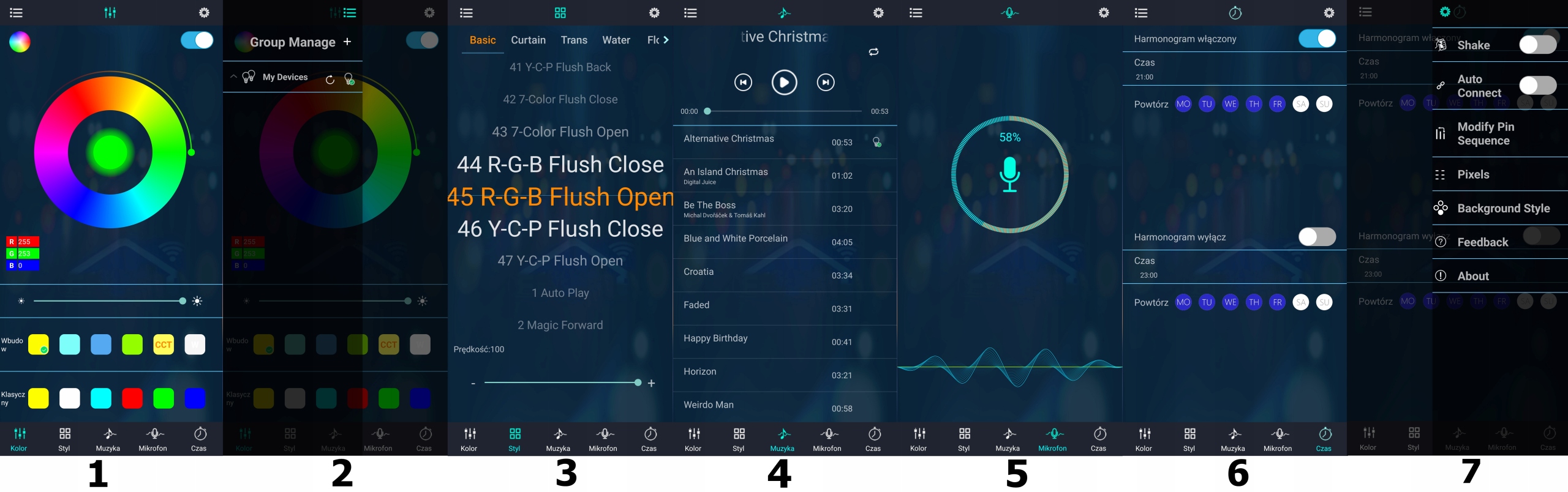 1️⃣Зміна кольори з палітри RGB , налаштування яскравості, вибір конкретного готового кольору.