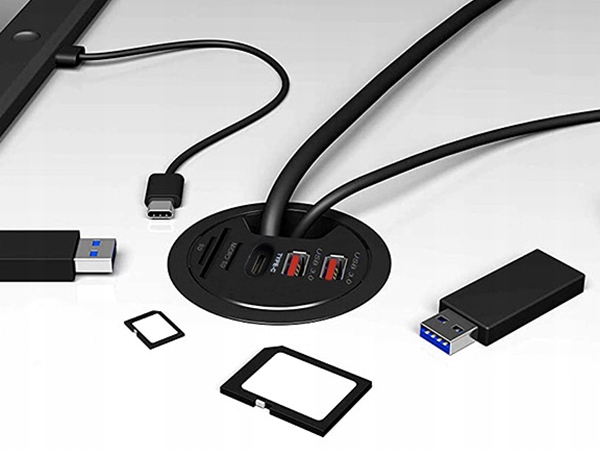 Серія Mediaport Spacetronik відрізняється оригінальним дизайном, який задовольнить потреби навіть найвимогливіших користувачів. Виготовлена з увагою до кожної деталі, кабельна втулка ідеально впишеться в робоче місце, інтер'єр шоуруму або конференц-залу. Гніздо має роз'єм USB-C, 2xUSB і слоти для карт пам'яті SD і TF.