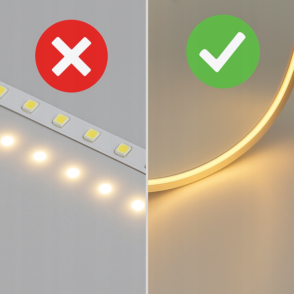 Сучасне дзеркало без рами з рівномірним освітленням COB - нуль світлодіодних «точок», красиве безперервне світіння та ідеально гладкі краї, відшліфовані на ЧПУ. Елегантність, функціональність і довговічність в одному
