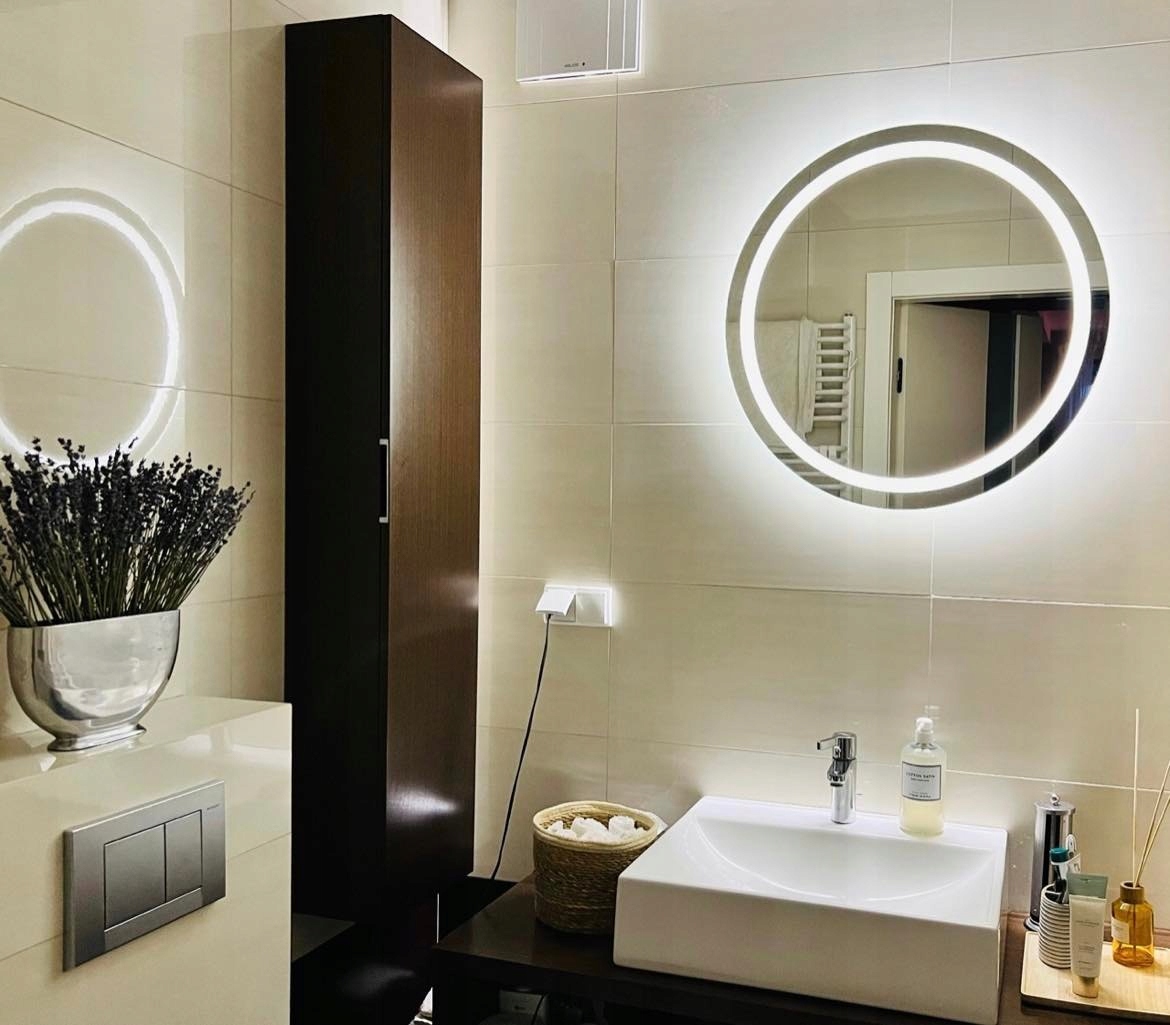 Сучасне кругле дзеркало зі світлодіодним підсвічуванням, діаметр 60 см, виготовлене з високоякісного скла товщиною 4 мм. Відшліфовані та відшліфовані краї.