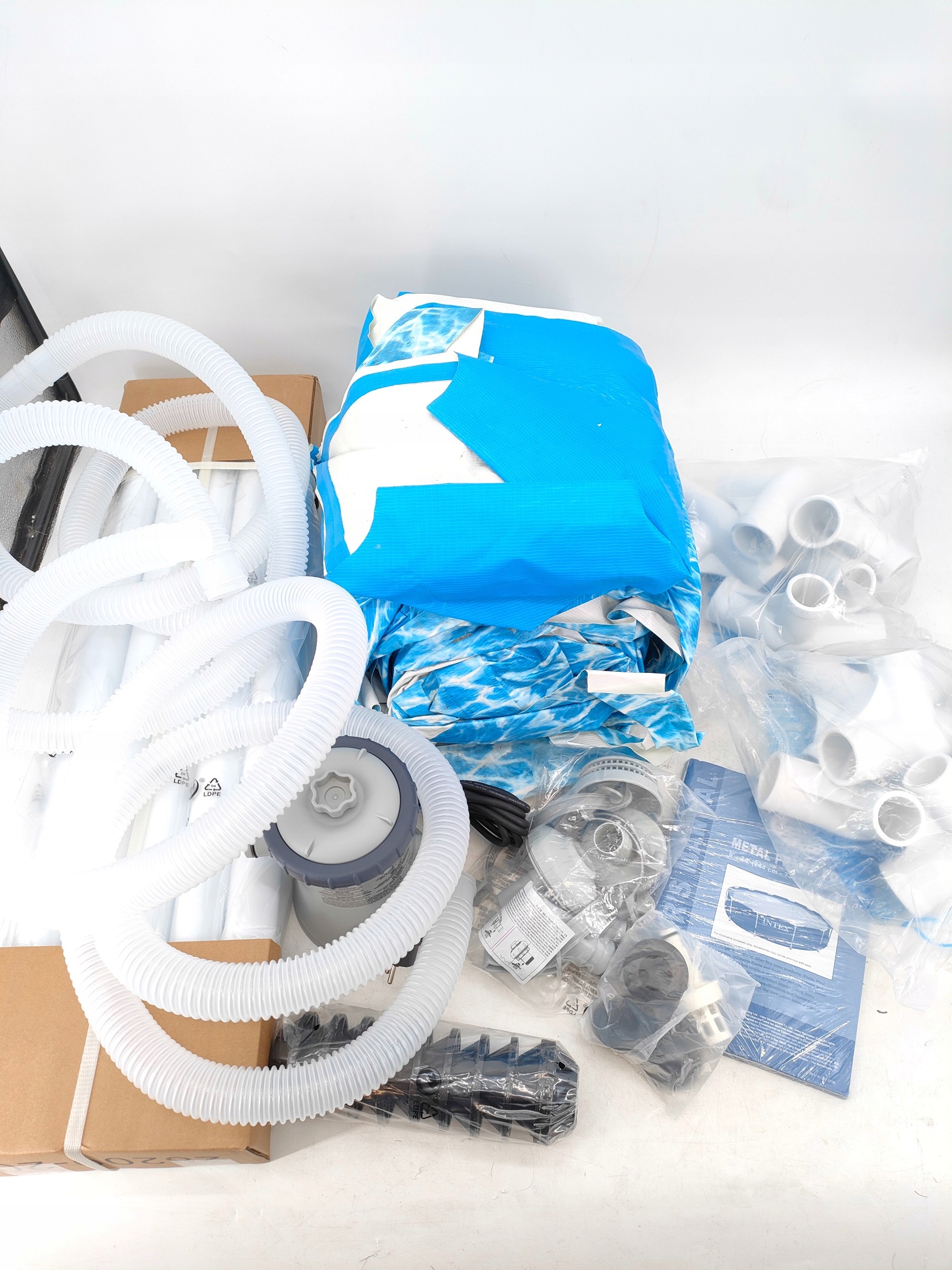 Басейн має видимий бруд, аксесуари щойно упаковані, насос із комплекту включається після підключення, містить інструкції