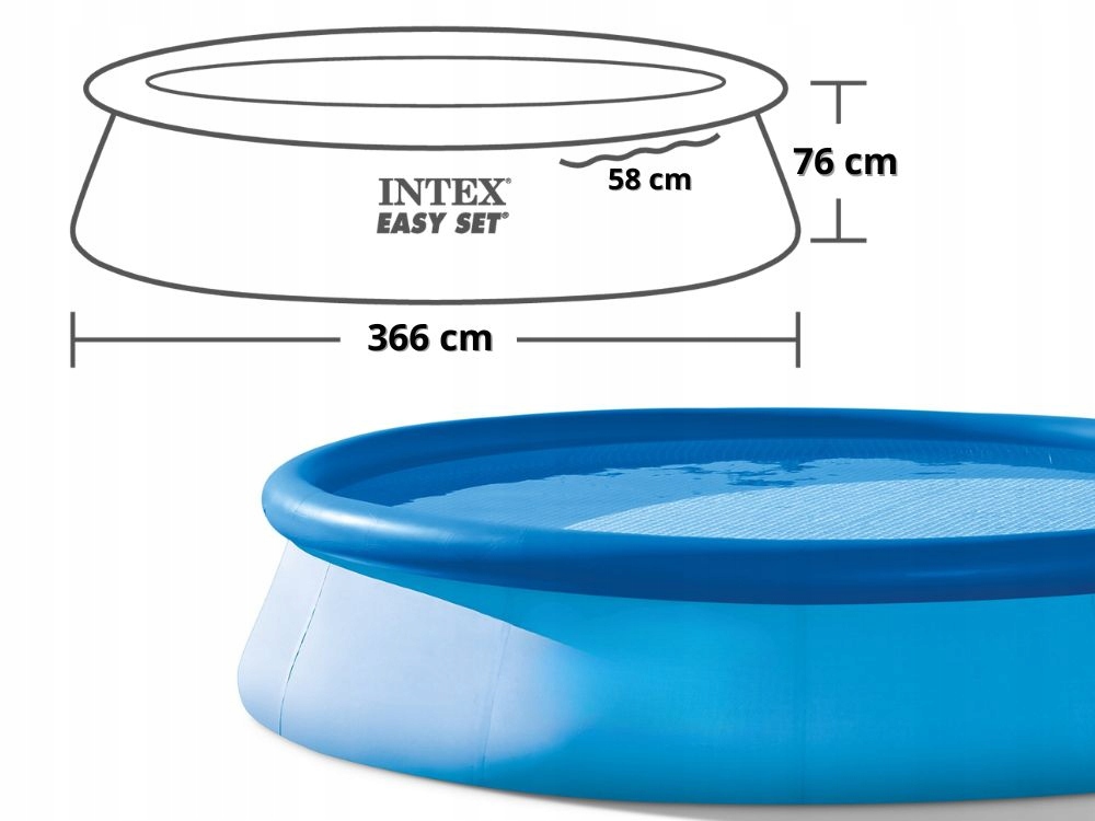 1. РОЗШИРЮВАЛЬНИЙ БАСЕЙН - басейн Easy Set фірми Intex, розмір 366 см x 76 см - місткість 5621 л. Виробник вказує заповнення водою на максимальному рівні 80%. Час встановлення становить приблизно 10 хвилин.