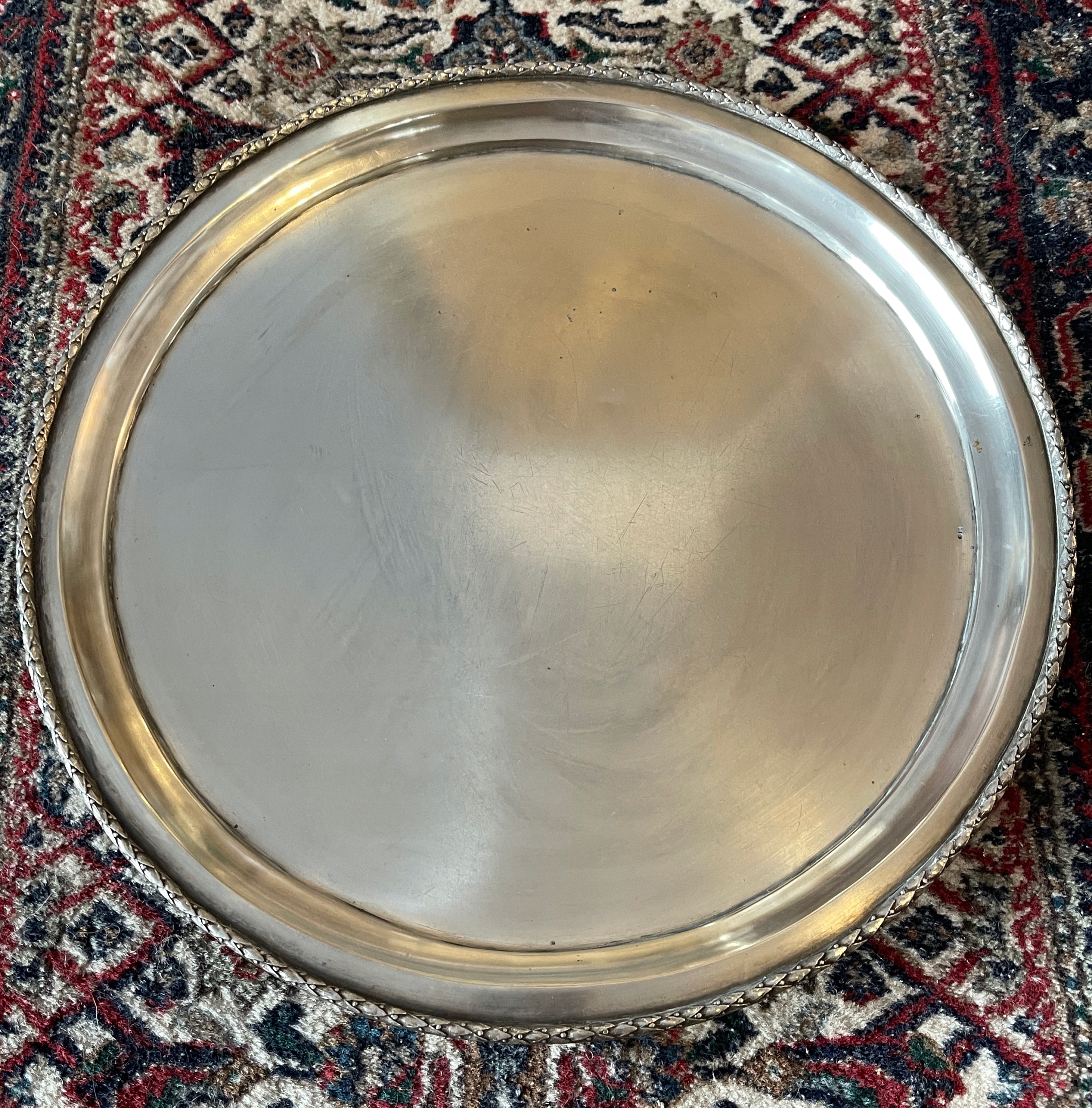 Велике срібне блюдо - тарілка з гладким дзеркалом і злегка піднятим краєм, прикрашена мотивом лаврового листа. Діаметр 36 см, вага 1020 грам, срібло "3", Польща.