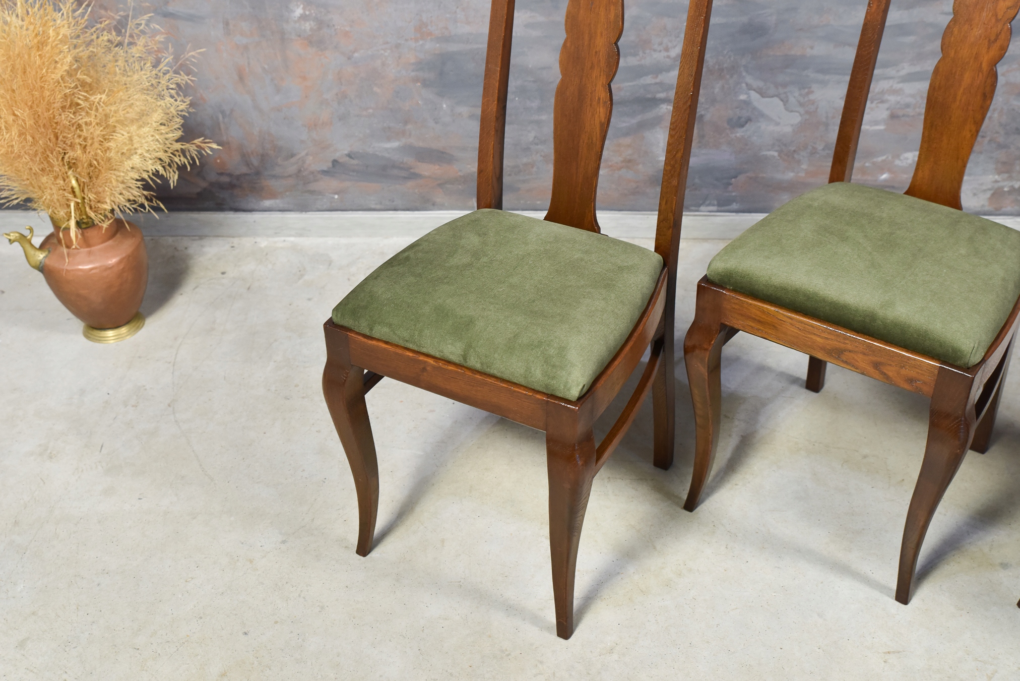 Набір повністю виготовлений з масиву горіха. І стільці, і стіл мають дуже цікаву форму.