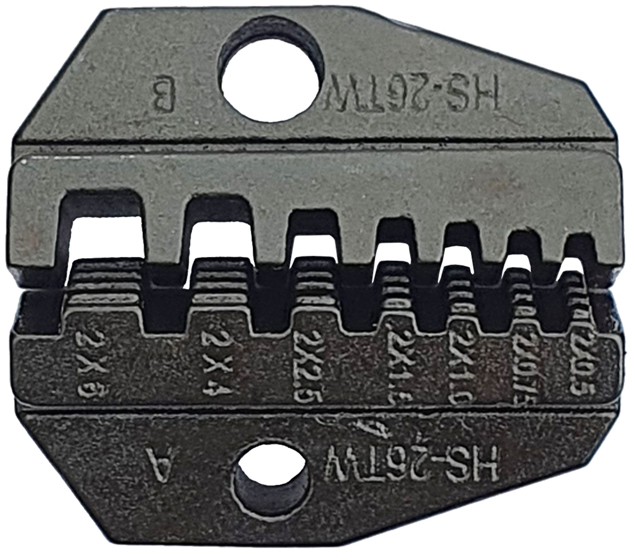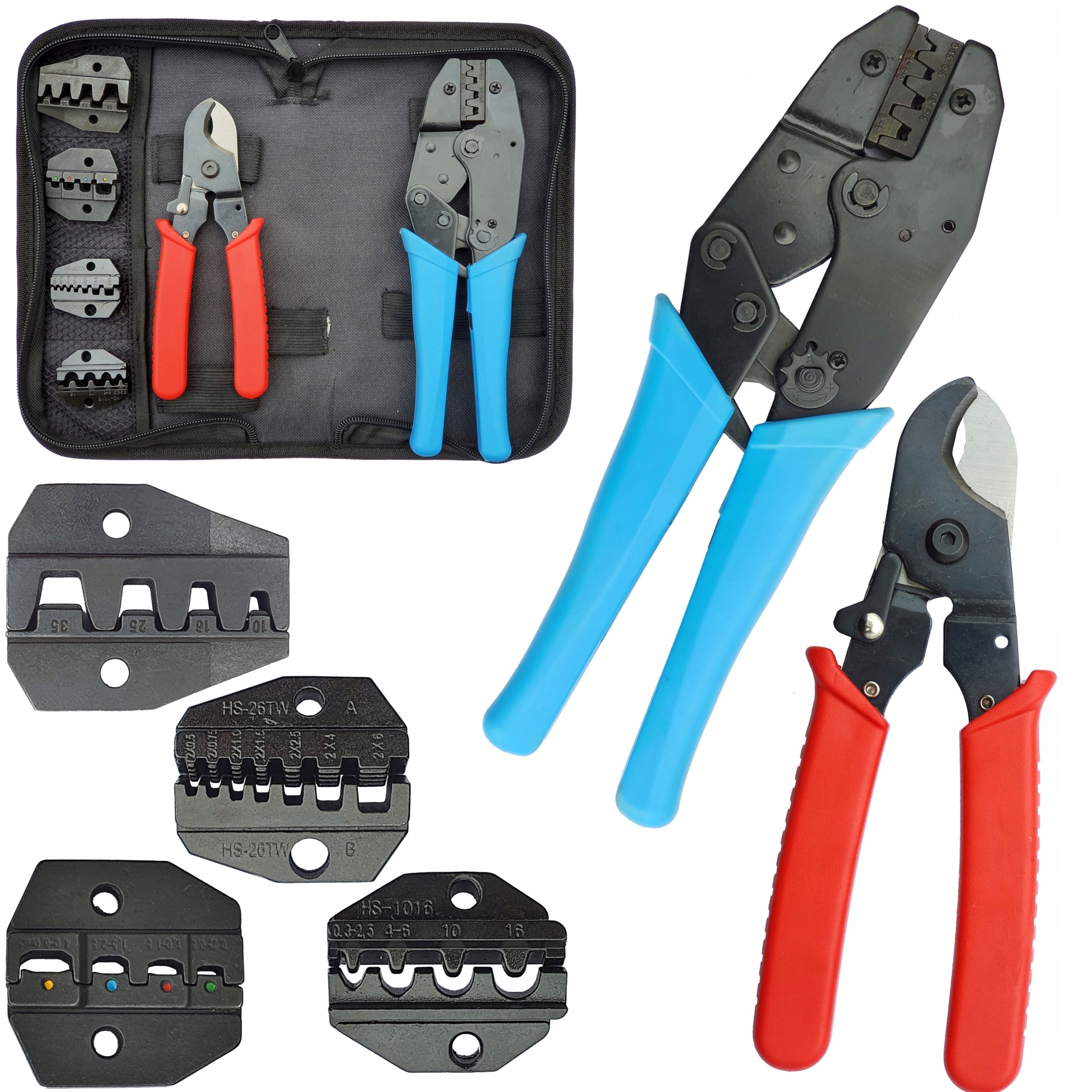 - Набір складається з кліщів з автоматичним регульованим храповим механізмом і змінних плашок, адаптованих до п’яти типів електротехнічних роз’ємів. Заміна плашок здійснюється відкручуванням.