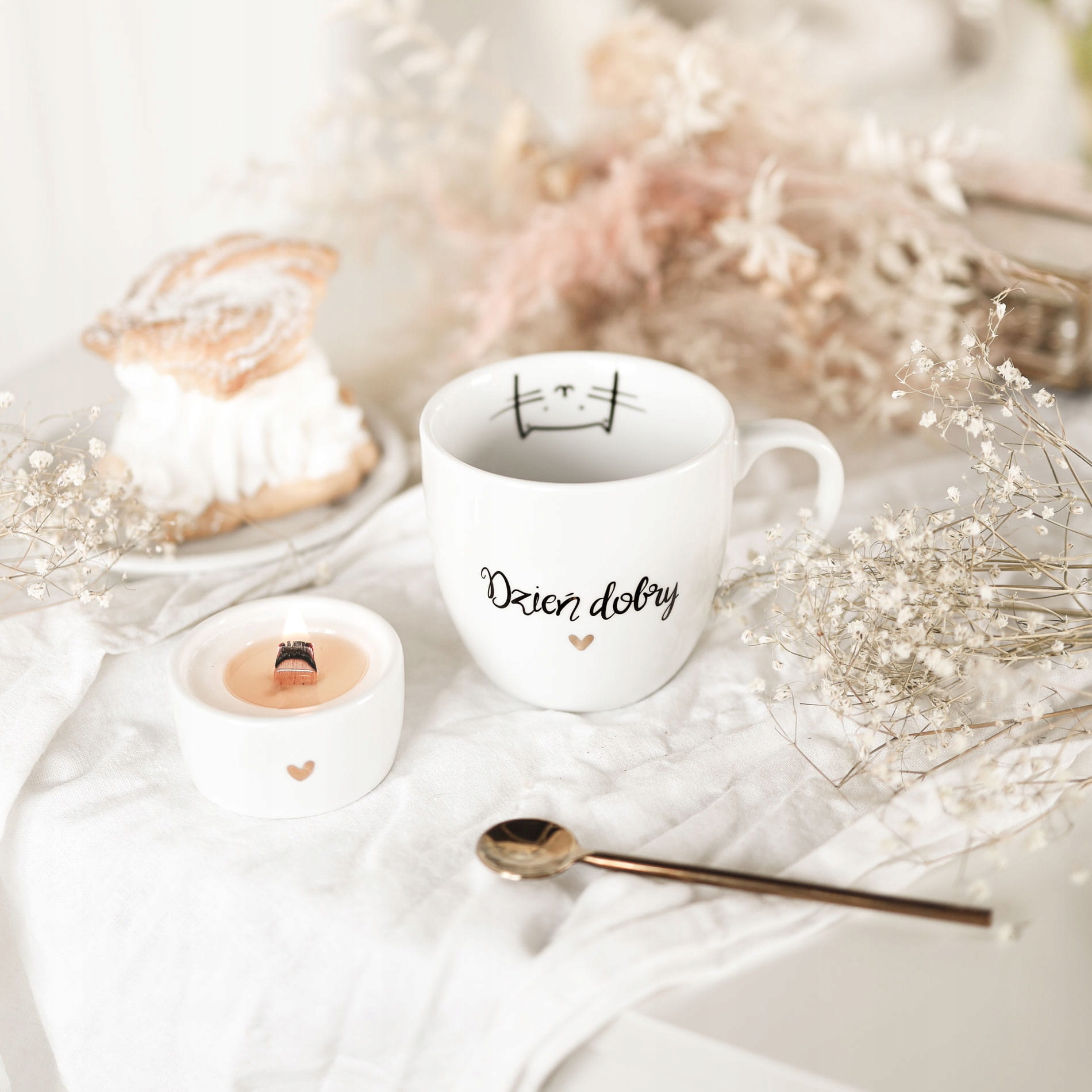 «Доброго ранку, кошеня» - це привітання, яке кожен з нас хоче почути вранці в першу чергу. Це знак ніжності, якою закохані діляться один з одним. Наша чашка, окрім послання кохання, має ще й гумористичний характер, який ми внесли, намалювавши всередині чашки милого кошеня.