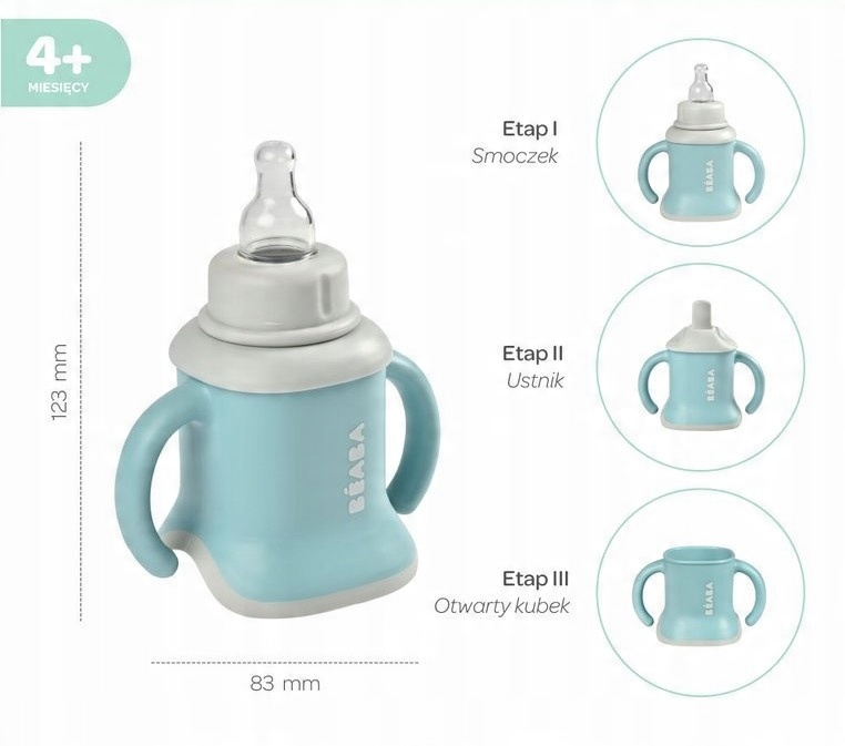 Зручна і легка тренувальна чашка 3 в 1 від французького бренду BEABA підходить для малюків від 4 місяців. Має ергономічну форму і дві зручні для маленьких ручок заокруглені бічні ручки, які полегшують самостійне стабільне утримання посудини. У комплект входить силіконова соска з антиколіковим вентиляційним отвором і складний загубник для дітей старшого віку. Кожен наконечник має свій ковпачок для зручної та гігієнічної заміни. У комплект також входить безпечна і щільна прозора кришка від соски. Це ідеальна еволюційна чашка для поступового навчання пити самостійно. На останньому етапі навчання пиття - з відкритої чашки - чашку можна використовувати без кришки. Має оптимальну місткість 150 мл. Антиковзаюча обробка на дні робить чашку стійкою та добре тримає стіл.