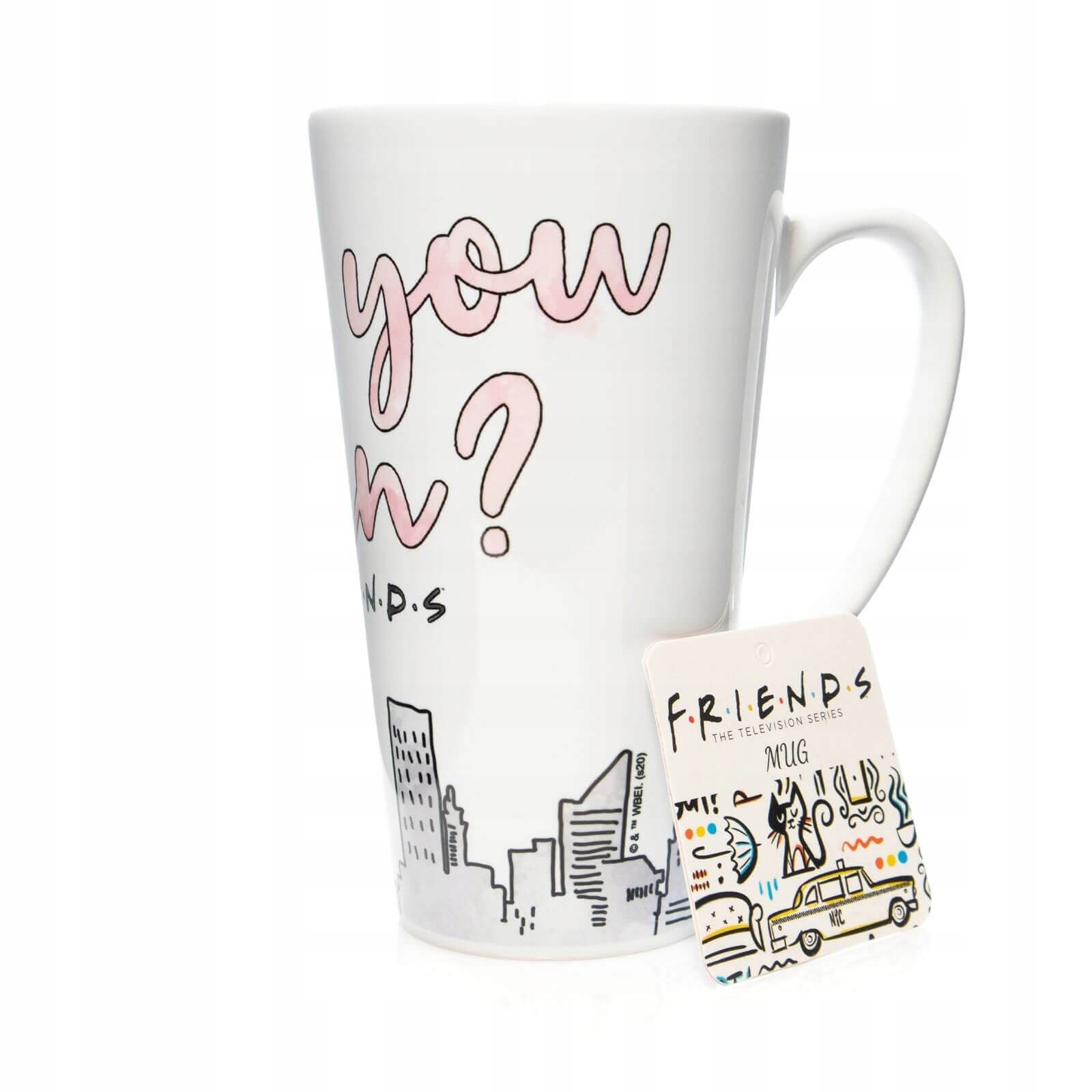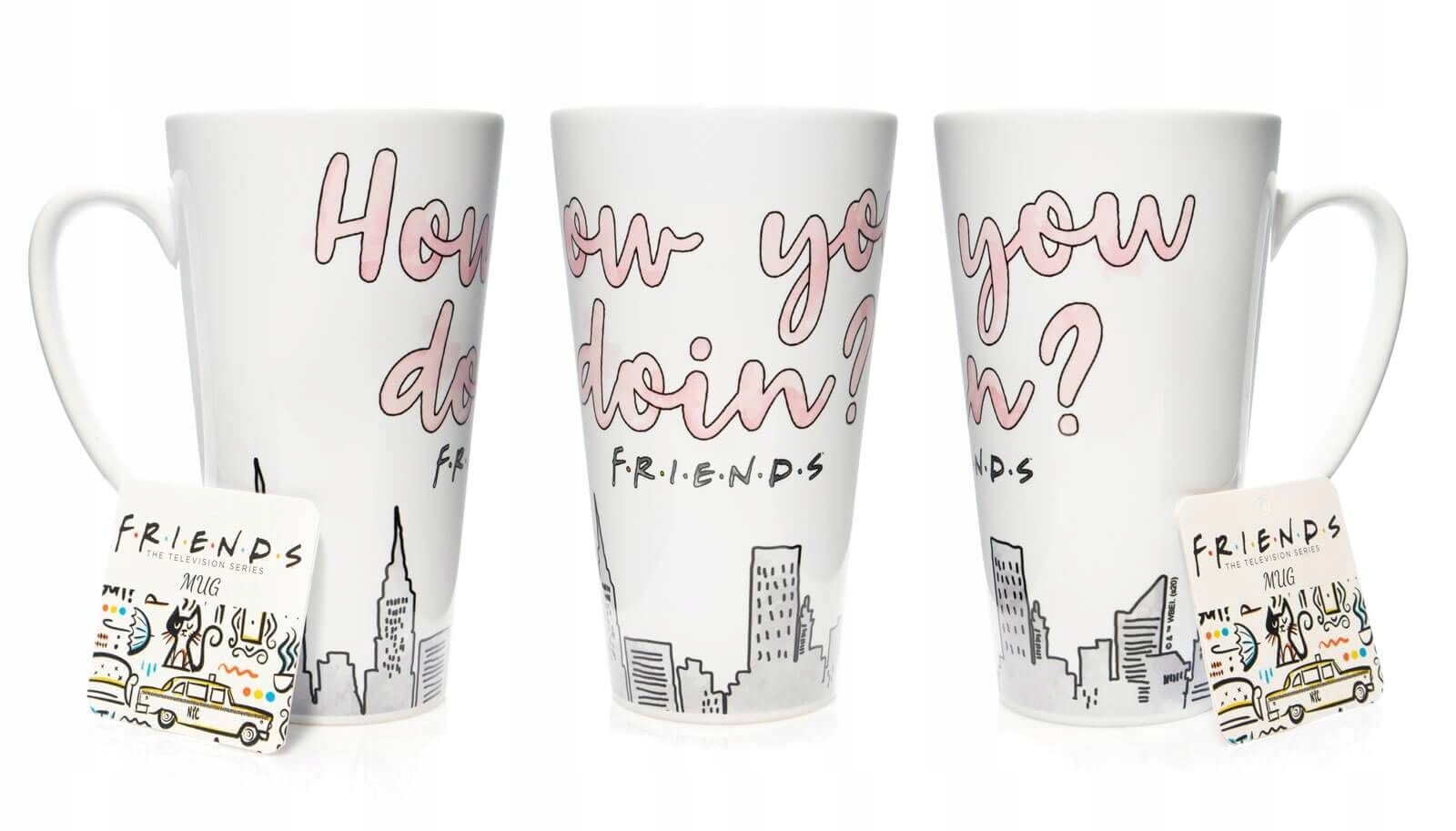 Оригінальна чашка для латте Friends з ручкою. Виготовлений з високоякісної кераміки. Графіка на кухлі міцна та чітка. Він сертифікований і підходить для контакту з харчовими продуктами. Упакований в білу коробку. Призначений для ручного прання.
